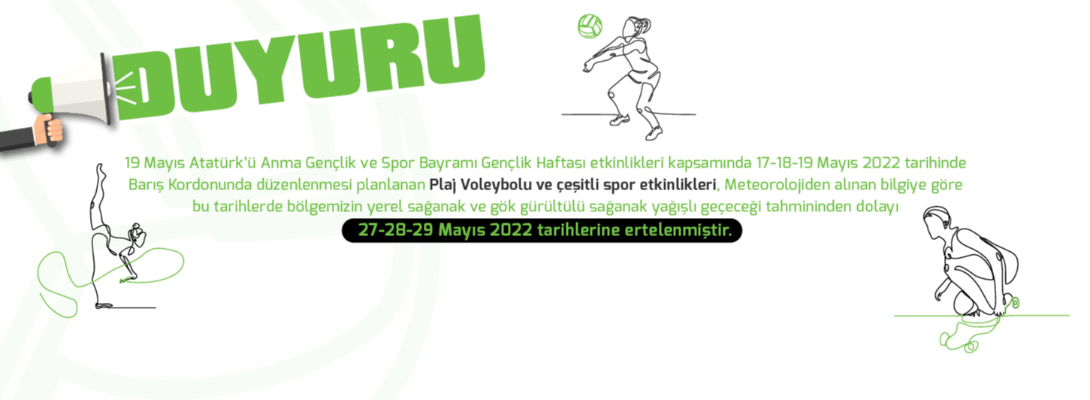 19 Mayıs Atatürk’ü Anma Gençlik ve Spor Bayramı Gençlik Haftası etkinlikleri kapsamında 17-18-19 Mayıs 2022 tarihinde Barış Kordonunda düzenlenmesi planlanan Plaj Voleybolu ve çeşitli spor etkinlikleri, Meteorolojiden alınan bilgiye göre bu tarihlerde bölgemizin yerel sağanak ve gök gürültülü sağanak yağışlı geçeceği tahmininden dolayı 27-28-29 Mayıs 2022 tarihlerine ertelenmiştir.