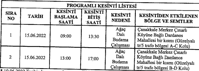 Uludağ Elektrik Dağıtım A.Ş. Çanakkale İşletme Bakım Mühendisliğinden yapılan açıklamaya göre;