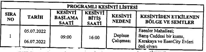 Enerji dağıtım şebekesinde yapılacak olan deplase çalışması kapsamında görselde belirtilen tarih ve belirtilen yerlerde elektrik kesintisi uygulanacaktır.