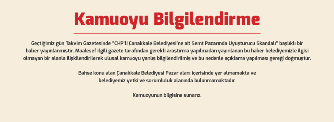 Geçtiğimiz gün Takvim Gazetesinde “CHP'li Çanakkale Belediyesi'ne ait Semt Pazarında Uyuşturucu Skandalı” başlıklı bir haber yayınlanmıştır. Maalesef ilgili gazete tarafından gerekli araştırma yapılmadan yayınlanan bu haber belediyemizle ilgisi olmayan bir alanla ilişkilendirilerek ulusal kamuoyu yanlış bilgilendirilmiş ve bu nedenle açıklama yapılması gereği doğmuştur.