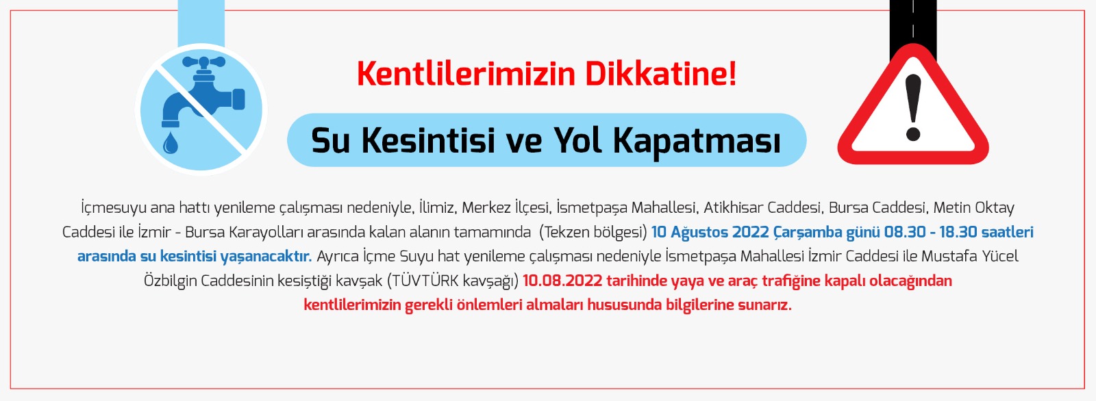 İçmesuyu ana hattı yenileme çalışması nedeniyle, İlimiz, Merkez İlçesi, İsmetpaşa Mahallesi, Atikhisar Caddesi, Bursa Caddesi, Metin Oktay Caddesi ile İzmir - Bursa Karayolları arasında kalan alanın tamamında ( Tekzen bölgesi ) 10 Ağustos 2022 Çarşamba günü 08.30 - 18.30 saatleri arasında su kesintisi yaşanacaktır. Ayrıca İçme Suyu hat yenileme çalışması nedeniyle İsmetpaşa Mahallesi İzmir Caddesi ile Mustafa Yücel Özbilgin Caddesinin kesiştiği kavşak ( TÜVTÜRK kavşağı ) 10.08.2022 tarihinde yaya ve araç trafiğine kapalı olacağından ketlilerimizin gerekli önlemleri almaları hususunda bilgilerine sunarız.