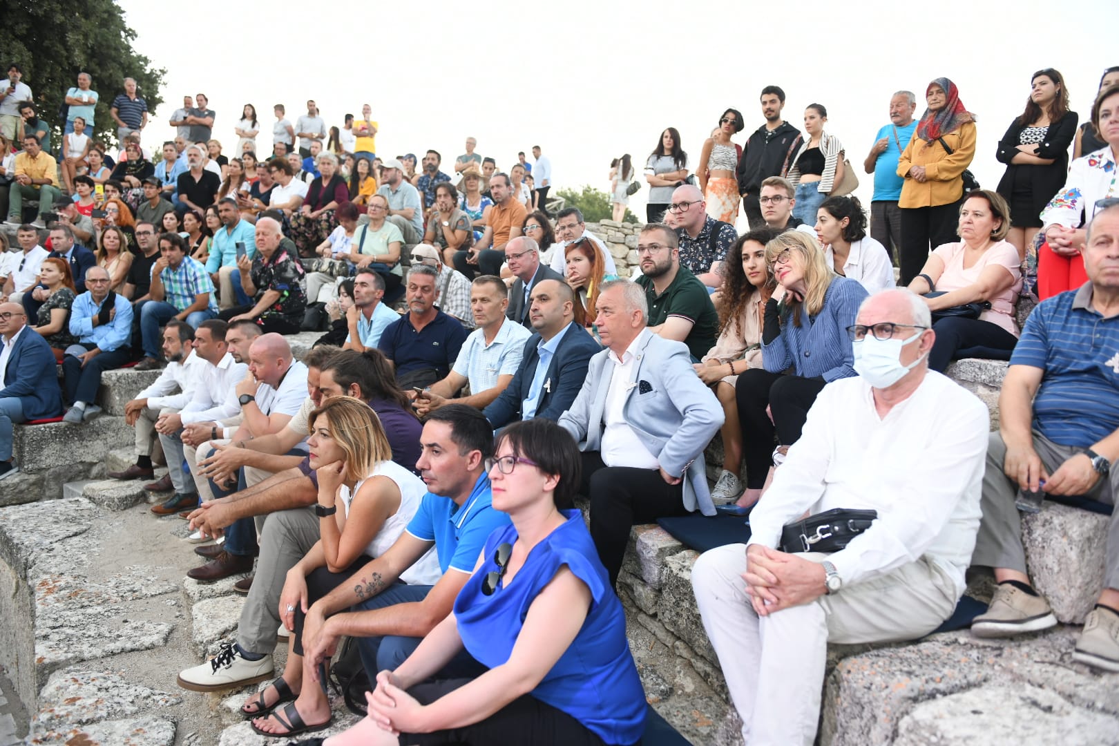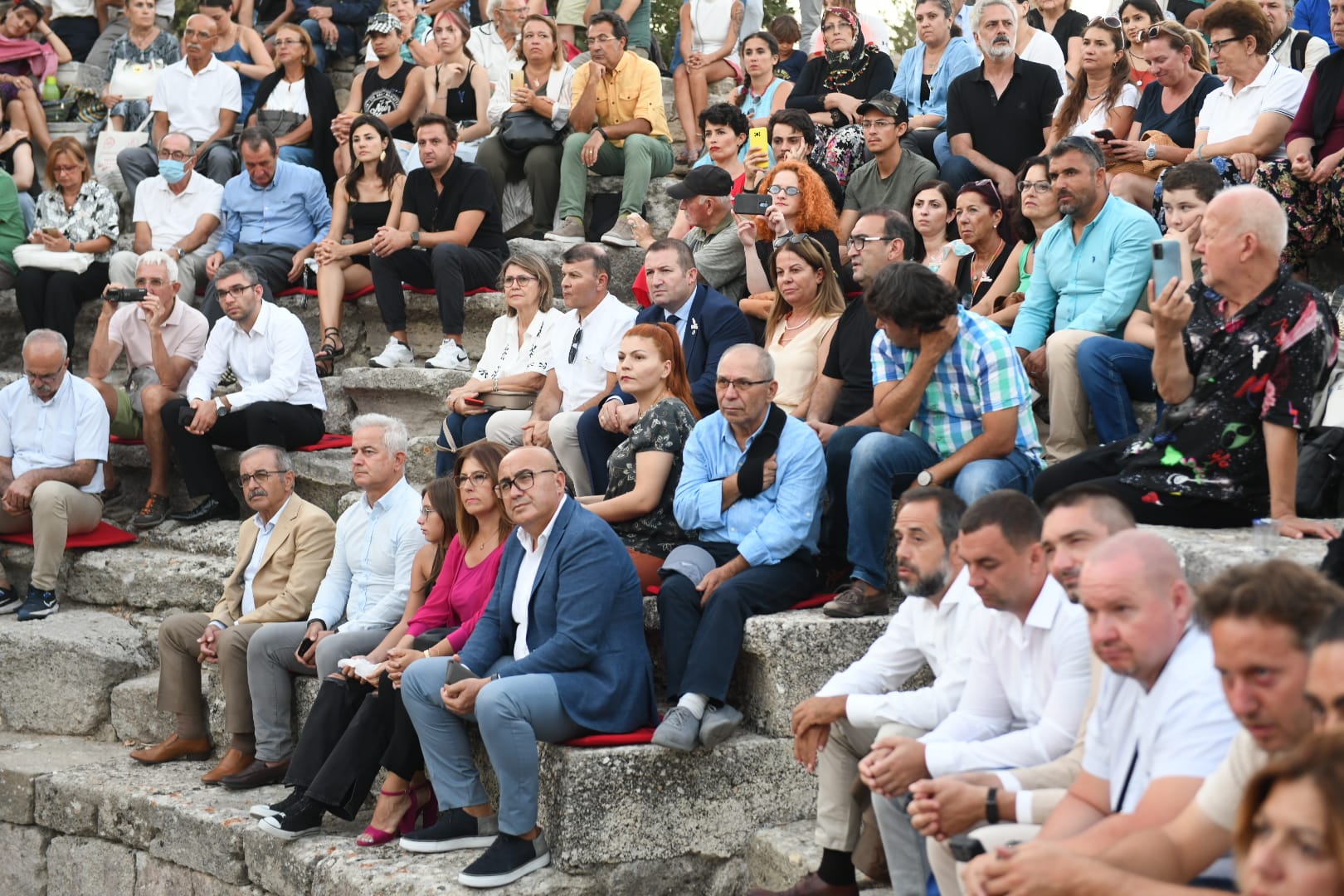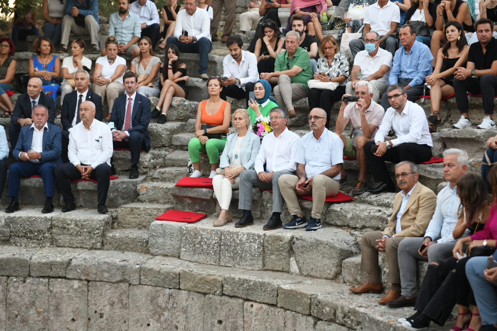 “Troia odeonunun basamaklarındasınız, Sanat da adeta yüksek uygarlığın basamaklarıdır. Işıklarınızla aydınlattığınız Troia akşamındasınız. Sanat da insanlığı karanlıktan, aydınlığa çıkaran yoldur, dünyayı herkes için daha güzel, daha yaşanılası bir yer yapandır. Oysa pandemide; sokaklarımız insansız, insanlarımız sanatsız, sanatçılarımız aşsız, işsiz ve umutsuz kaldı. Sanatın sadece salgınla değil, siyasetle de sınavı büyüktü. Karnını doyurabilmek için enstrümanını satanlar oldu, tünelin ucunda sanatına dair hiçbir ışık göremeyip canına kıyanlar oldu. Çünkü lebalep parti toplantılarına uğramayan virüs, konserlerde, sinemalarda, tiyatrolarda aranır oldu. Siyaset gerçek sanatçılardan nasibini almadı. Ama pandemi sürecinde “sözde sanatçılar” siyasetten çokça nasiplendi. Onun için muktedirlerin sanatçıları değil, halkın sanatçıları var olsun, sanat daim olsun diyoruz”.
