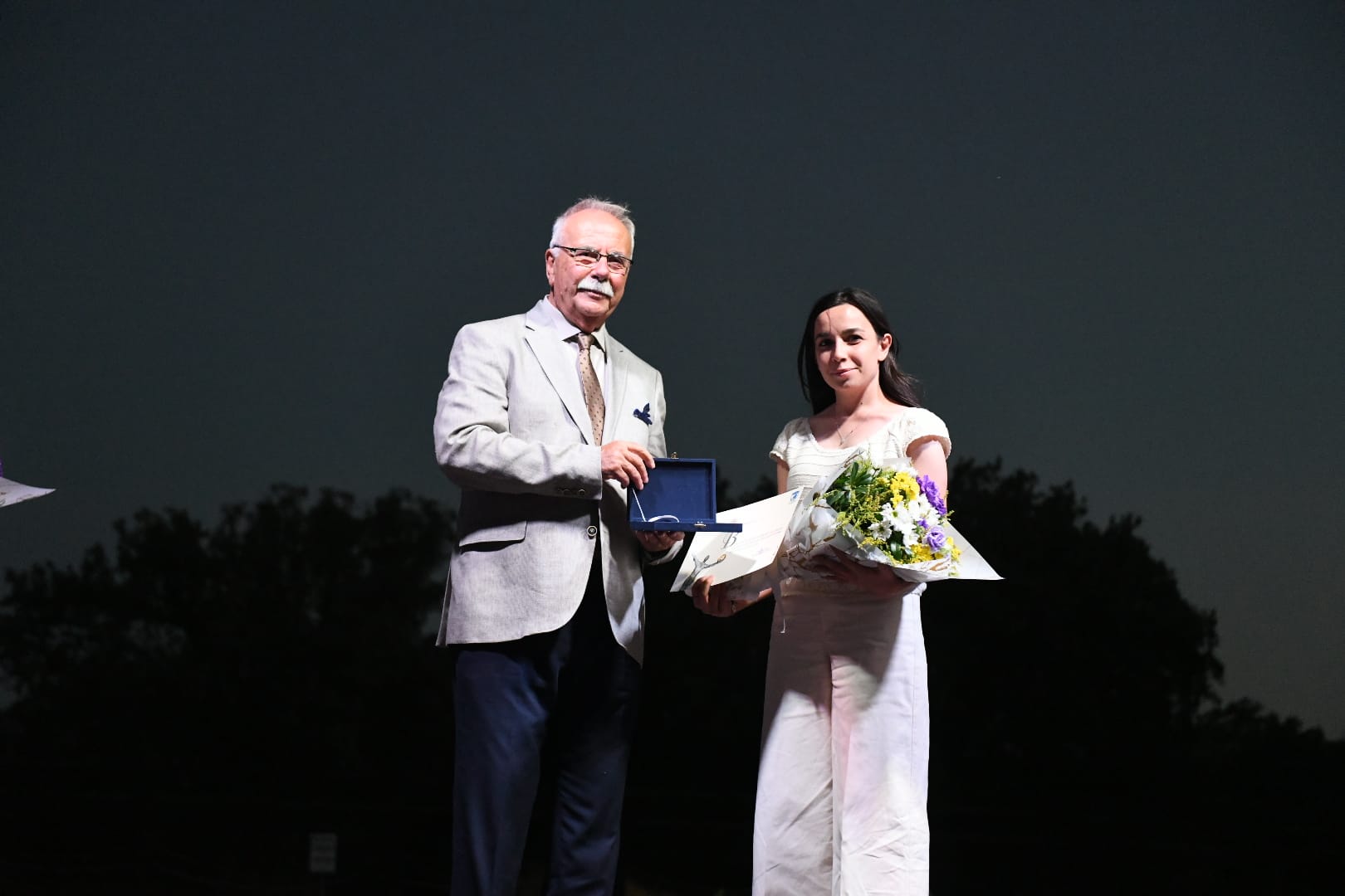 Başkan Gökhan konuşmasının ardında 59. Uluslararası Troia Festivali için düzenlenen afiş yarışmasında birincilik ödülünü alan Elif Berfu Genç ve yarışmada mansiyon ödüllerine layık görülen Şeyma Altın ve Seyit Harun Ergün'e ödüllerini takdim etti.