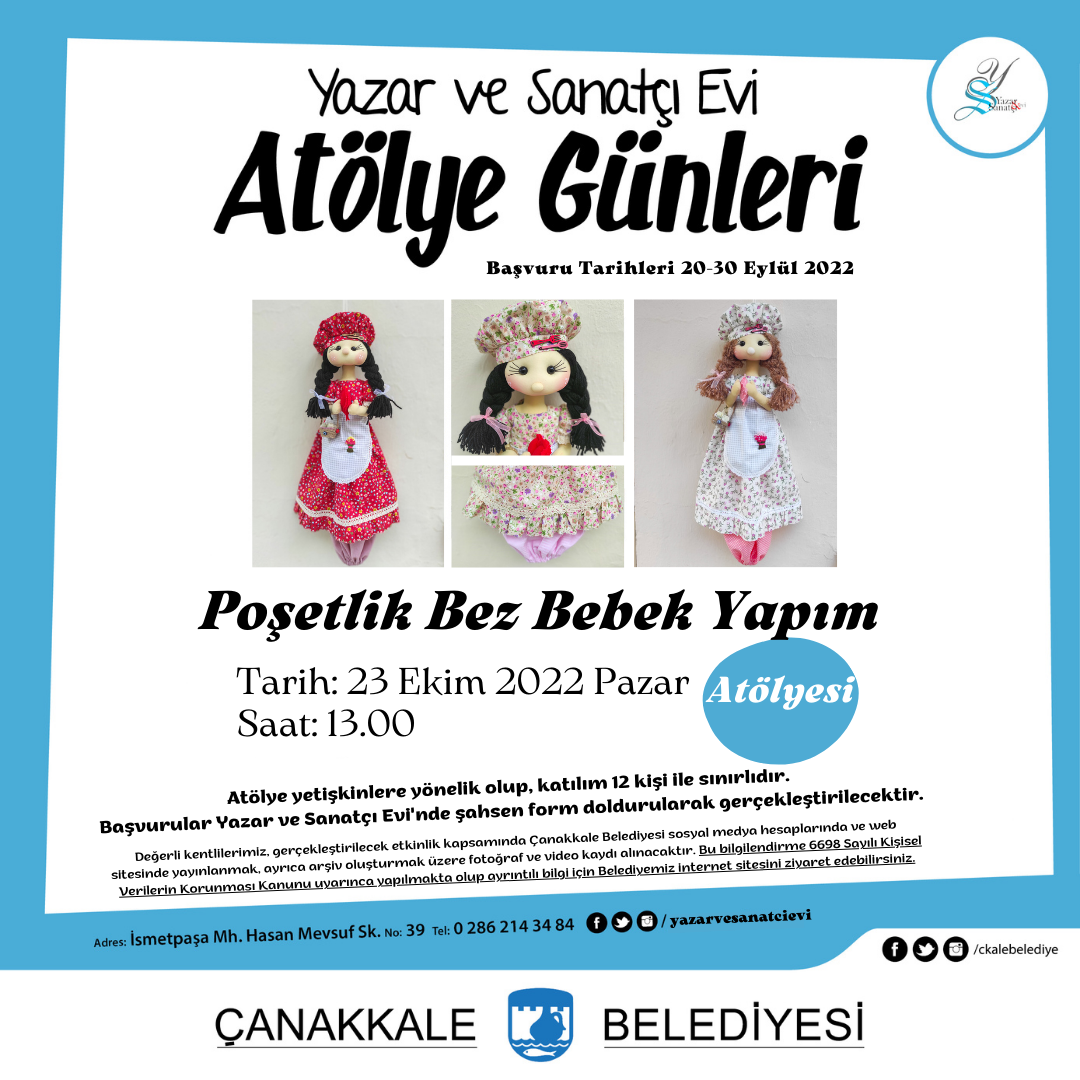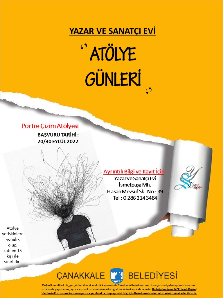 Çanakkale Belediyesi Yazar ve Sanatçı Evi, Ekim Ayında Kültür Etkinlikleri kapsamında yeni atölyeler sunuyor. Bir ay süreli olan ‘’Portre Çizim Atölyesi’’ ve tek günlük etkinlik şeklinde gerçekleştirilecek ‘’Poşetlik Bez Bebek Yapım Atölyesi’’ için kayıtlar 20 Eylül 2022 Salı günü başlıyor.