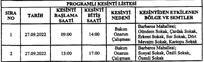 Enerji nakil hatlarında yapılacak olan bakım onarım çalışması kapsamında görselde belirtilen tarih ve belirtilen yerlerde elektrik kesintisi uygulanacaktır.
