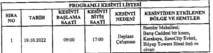 Enerji Nakil Hatlarında yapılacak deplase çalışması kapsamında görselde belirtilen tarih ve belirtilen yerlerde elektrik kesintisi uygulanacaktır.