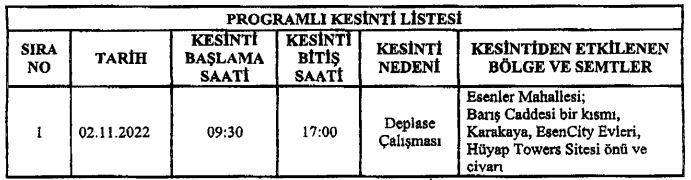 Enerji Nakil Hatlarında yapılacak olan deplase çalışması kapsamında görselde belirtilen tarih ve belirtilen yerlerde elektrik kesintisi uygulanacaktır.