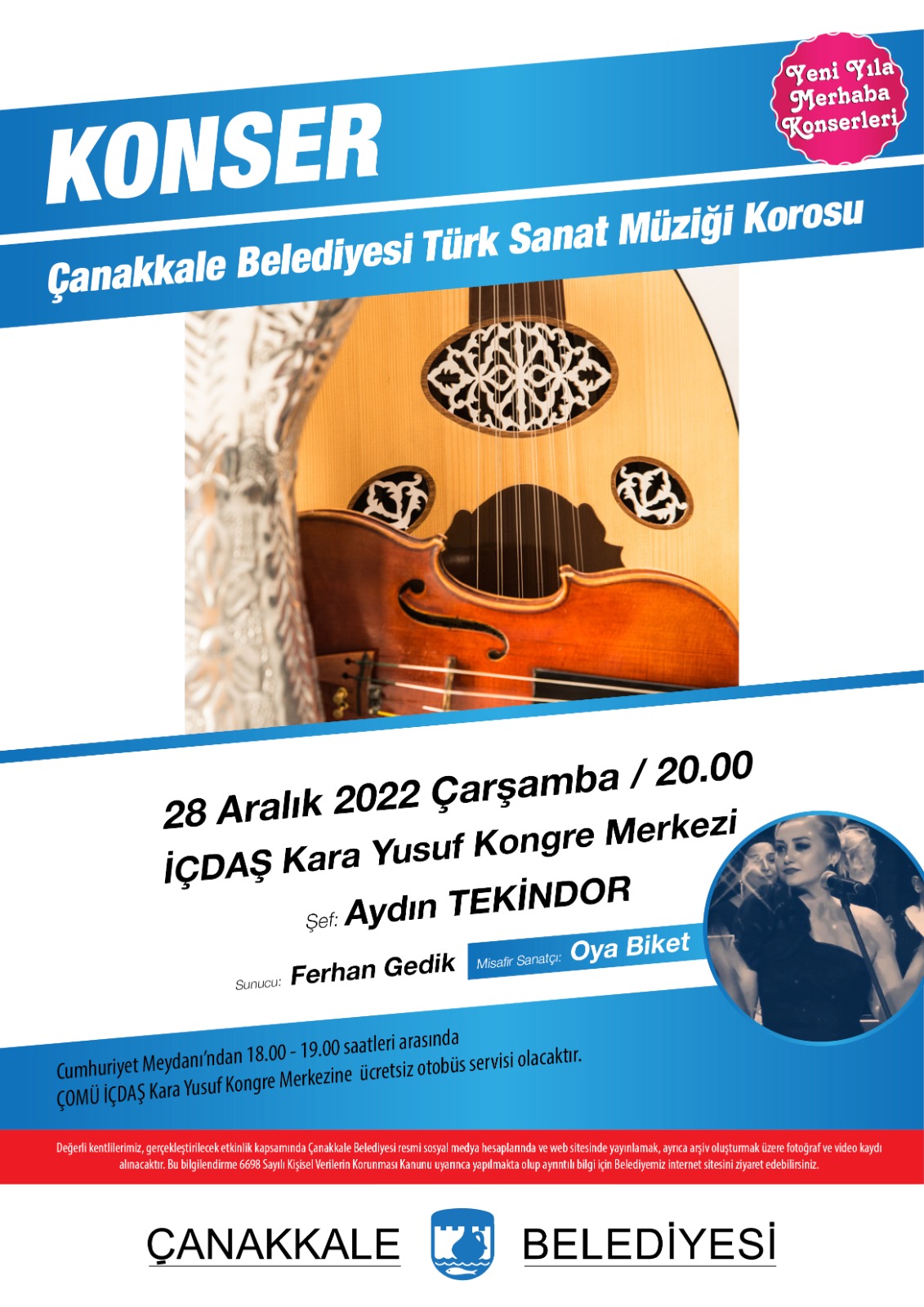Çanakkale Belediyesi Türk Sanat Müziği Korosunun Şef Aydın Tekindor önderliğindeki konseri ise 28 Aralık 2022 Çarşamba günü saat 20.00'de ÇOMÜ İçdaş Kara Yusuf Kongre Merkezinde sahnelenecek.