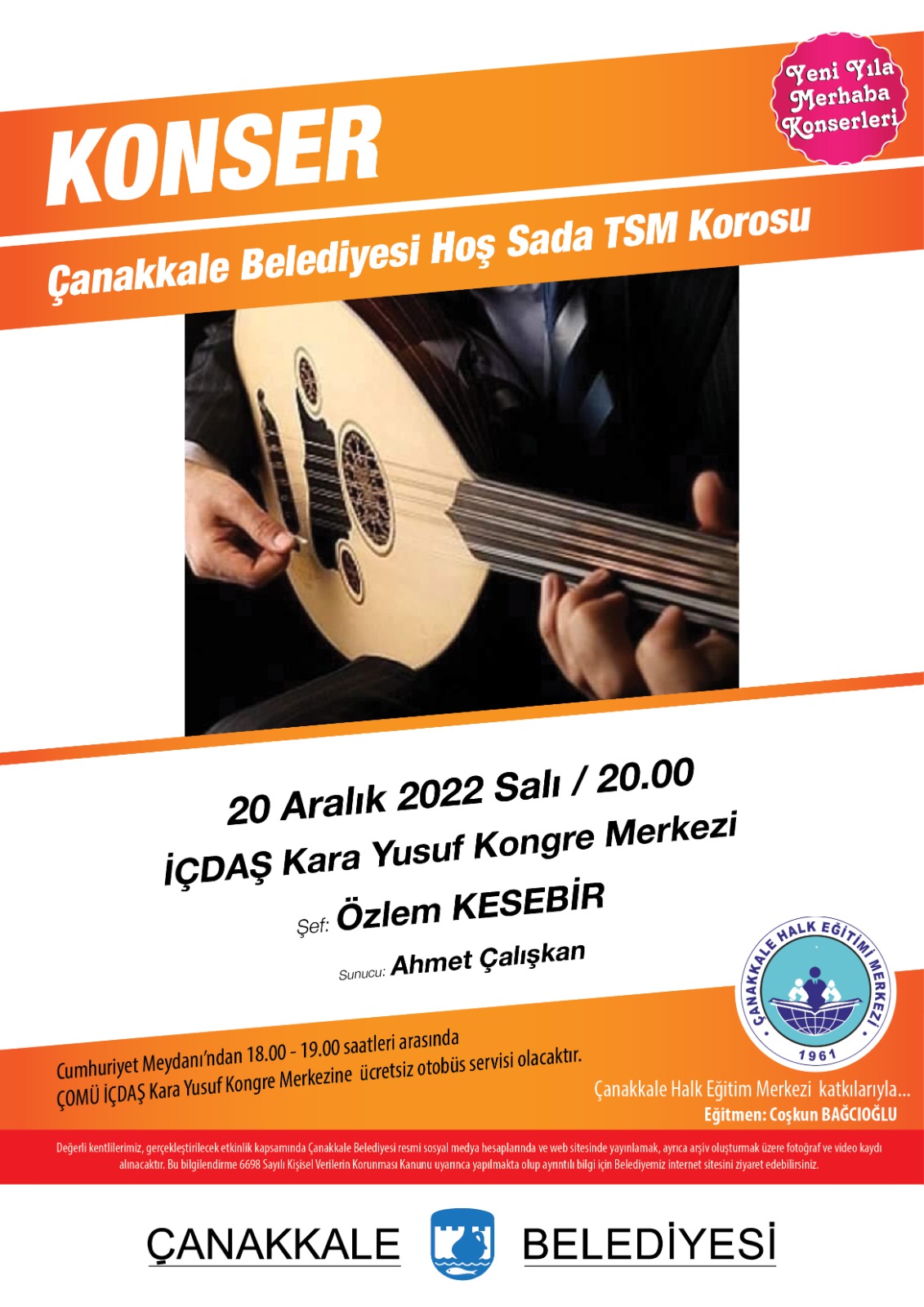 Çanakkale Belediyesi Hoş Sada Türk Sanat Müziği Korosunun Şef Özlem Kesebir önderliğindeki konseri 20 Aralık 2022 Salı günü saat 20.00'de,
