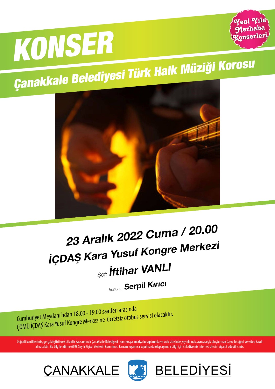 Çanakkale Belediyesi Türk Halk Müziği Korosunun Şef İftihar Vanlı önderliğindeki konseri 23 Aralık 2022 Cuma günü saat 20.00'de,