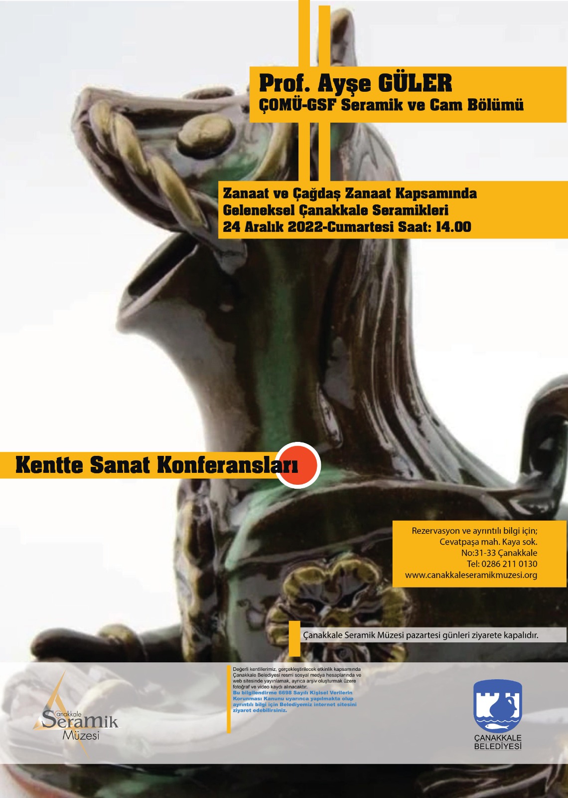 ÇOMÜ-GSF Seramik ve Cam Bölümünden Prof. Ayşe Güler'in konuşmacı olarak katılacağı 'Zanaat ve Çağdaş Zanaat Kapsamında Geleneksel Çanakkale Seramikleri' konferansı 24 Aralık 2022 Cumartesi günü saat 14.00'da Çanakkale Seramik Müzesinde gerçekleşecek.