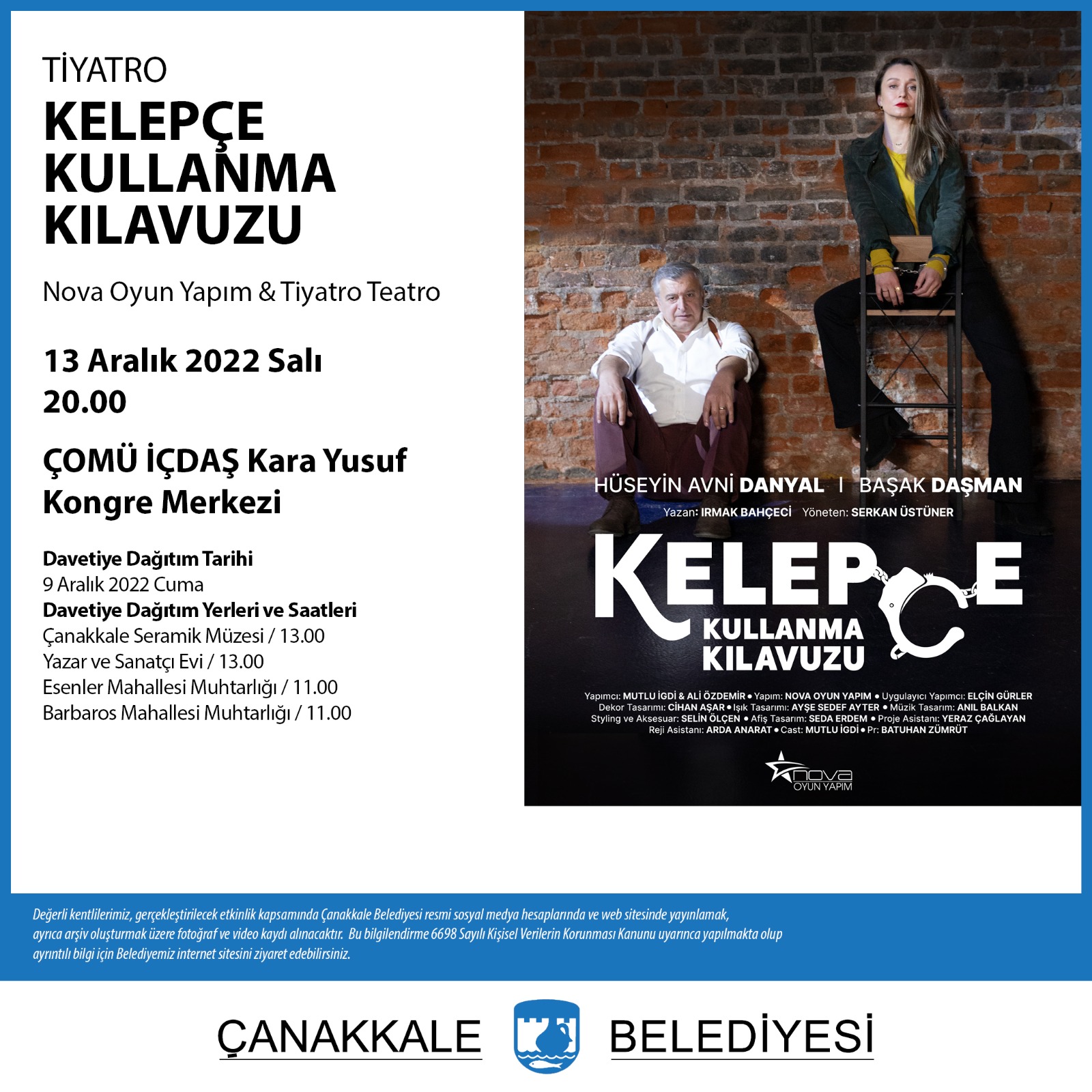 Hüseyin Avni Danyal ve Başak Daşman'ın rol aldığı tiyatro oyunu “Kelepçe Kullanma Kılavuzu”, 13 Aralık 2022 Salı günü saat 20.00'de ÇOMÜ İçdaş Kara Yusuf Kongre Merkezi'nde sanatseverlerle buluşacak.