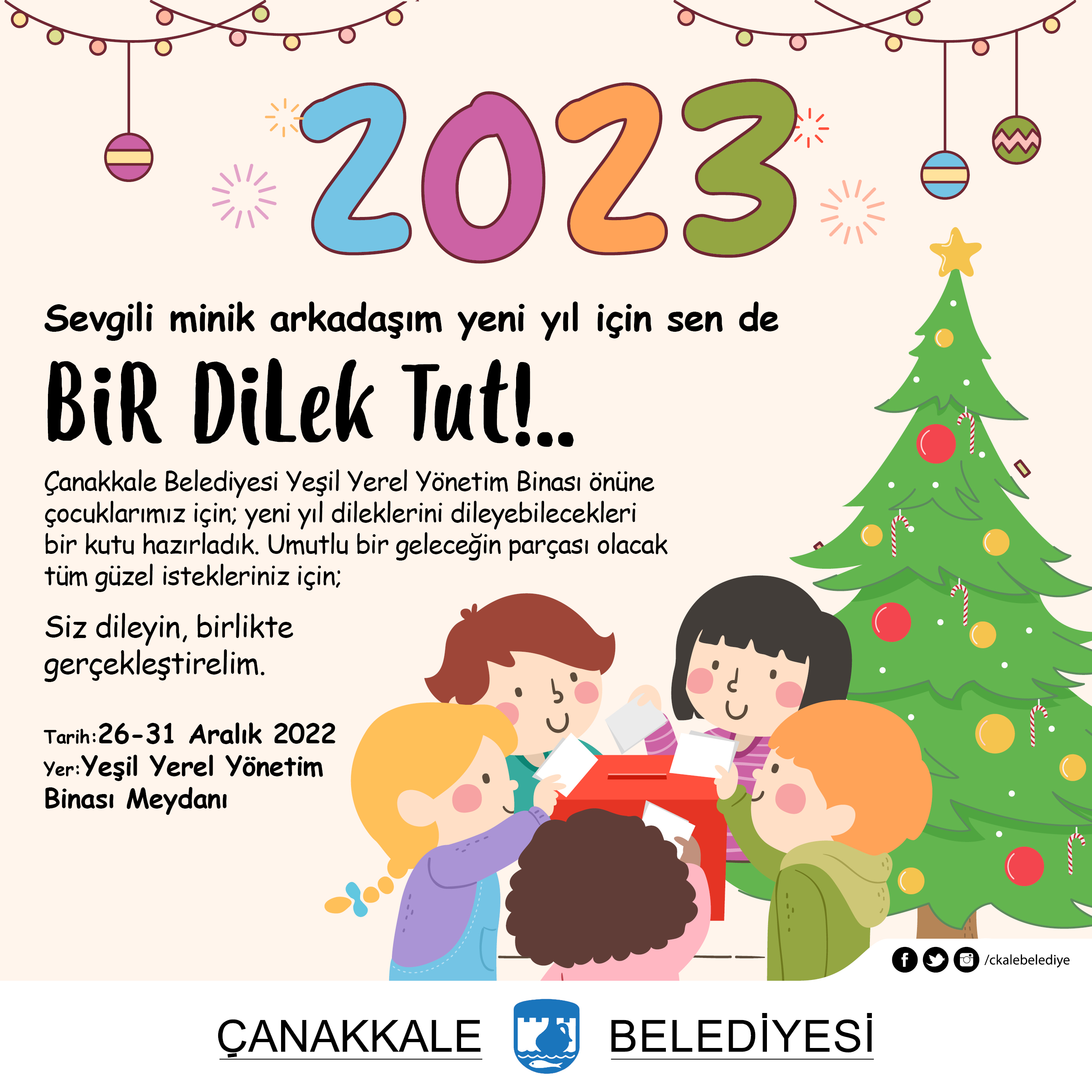 Çanakkale Belediyesi Yeşil Yerel Yönetim Binası önüne çocuklarımız için yeni yıl dileklerini dileyebilecekleri bir kutu hazırladık. 26 Aralık 2022 Pazartesi tarihi itibariyle Yeşil Yerel Yönetim Binası Meydanındaki yerini alacak olan dilek kutumuza, güzel dileklerini bırakmaları için tüm minik kentlilerimizi davet ediyoruz…