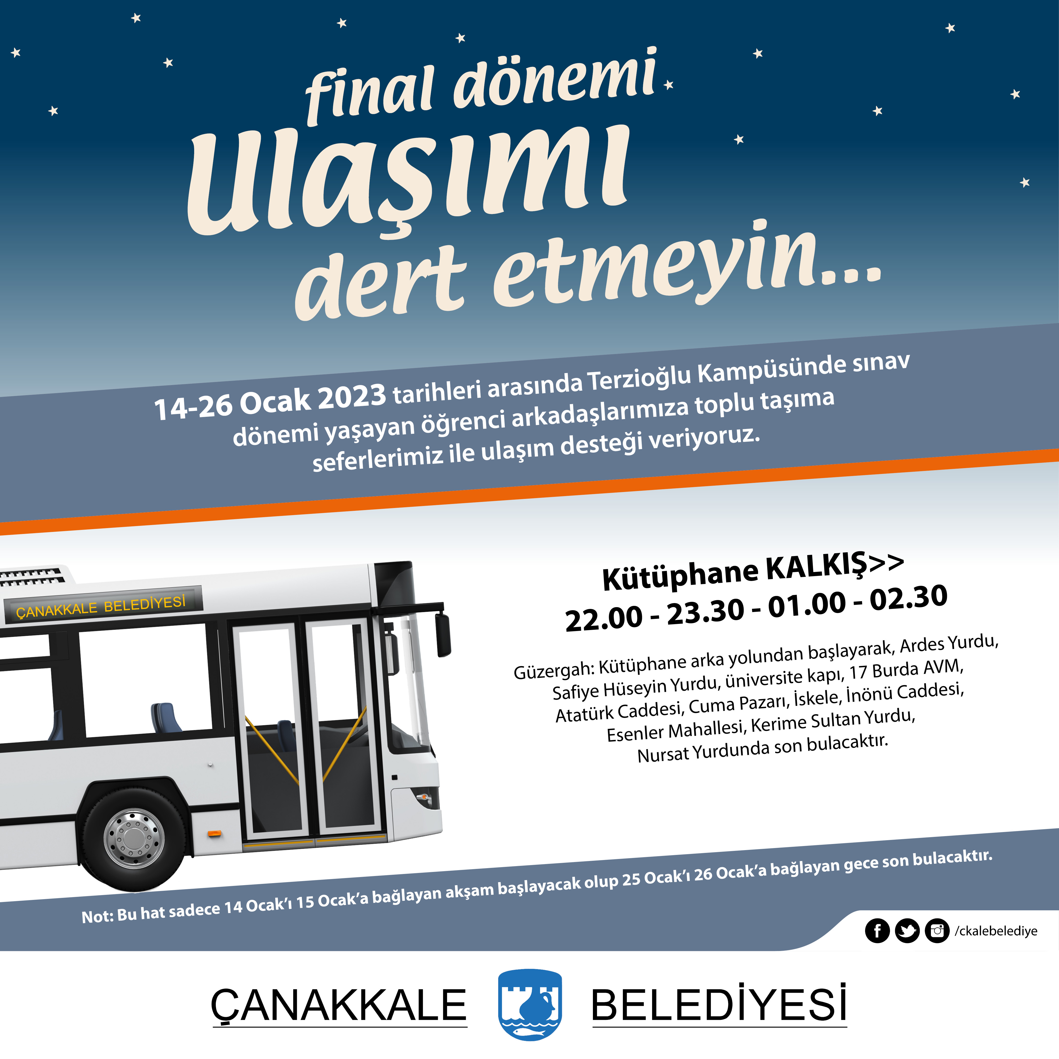 14-26 Ocak 2023 tarihleri arasında Terzioğlu Kampüsünde sınav dönemi yaşayan öğrenci arkadaşlarımıza toplu taşıma seferlerimiz ile ulaşım desteği veriyoruz.