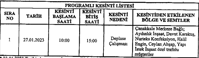 Uludağ Elektrik Dağıtım A.Ş. Çanakkale İşletme Bakım Mühendisliğinden yapılan açıklamaya göre;