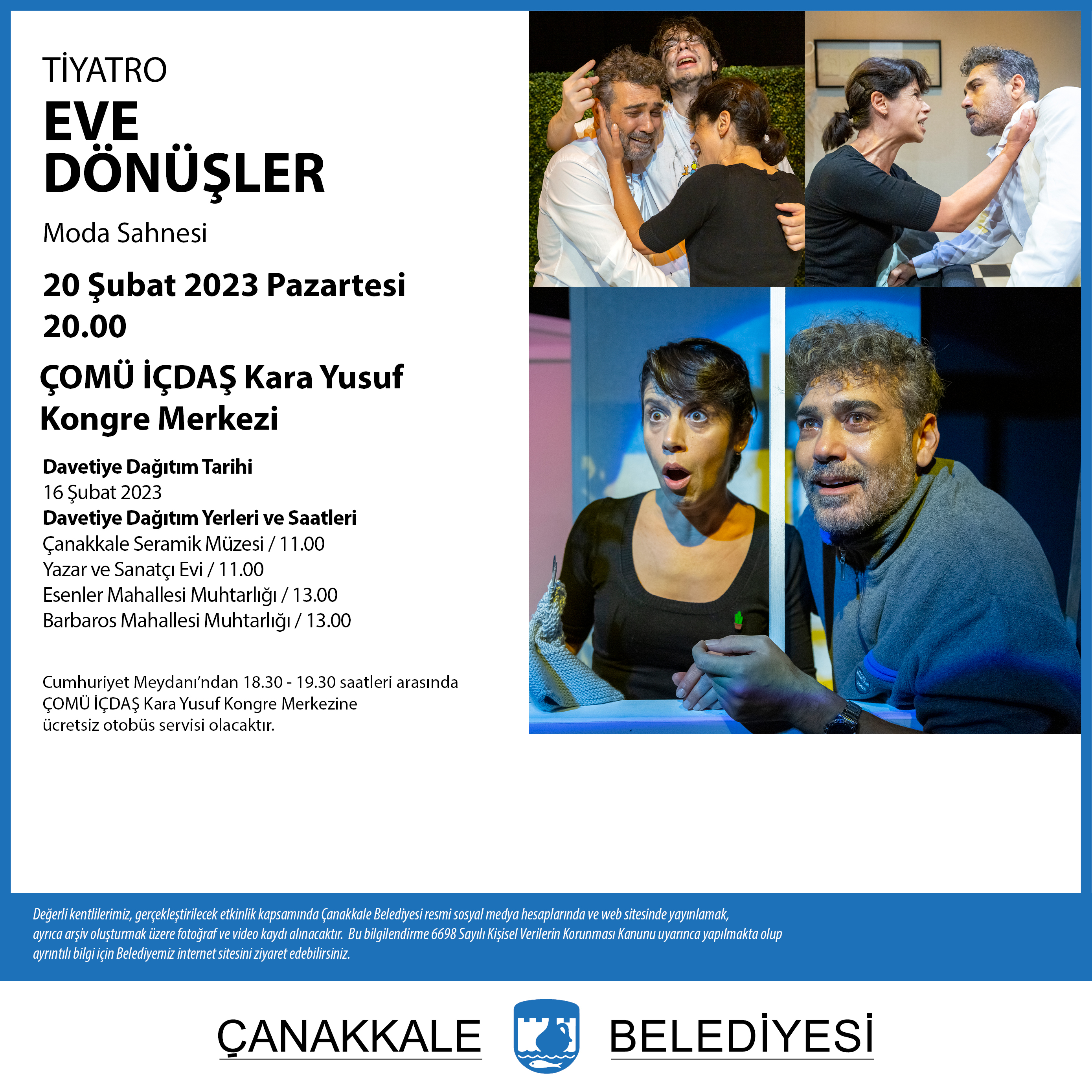 Çanakkale Belediyesi kültür sanat etkinlikleri kapsamında Şubat ayında “Eve Dönüşler” isimli tiyatro oyunu kentlilerimizle buluşacak. Kemal Aydoğan'ın yönettiği, Nalan Kuruçim, Caner Cindoruk, Alper Şimşek'in oynadığı Eve Dönüşler, 20 Şubat 2023 Pazartesi günü saat 20.00'de ÇOMÜ İçdaş Kara Yusuf Kongre Merkezinde sahnelenecek. Tiyatro oyunu için ücretsiz davetiye dağıtım tarihi 16 Şubat 2023 olup, davetiyeler Çanakkale Seramik Müzesi ile Yazar ve Sanatçı Evi'nden saat 11.00, Esenler ile Barbaros Mahalle Muhtarlıklarından ise saat 13.00 itibariyle temin edilebilir. Oyun için Cumhuriyet Meydanından 18.30-19.30 saatleri arasında ücretsiz otobüs servisi olacaktır.
