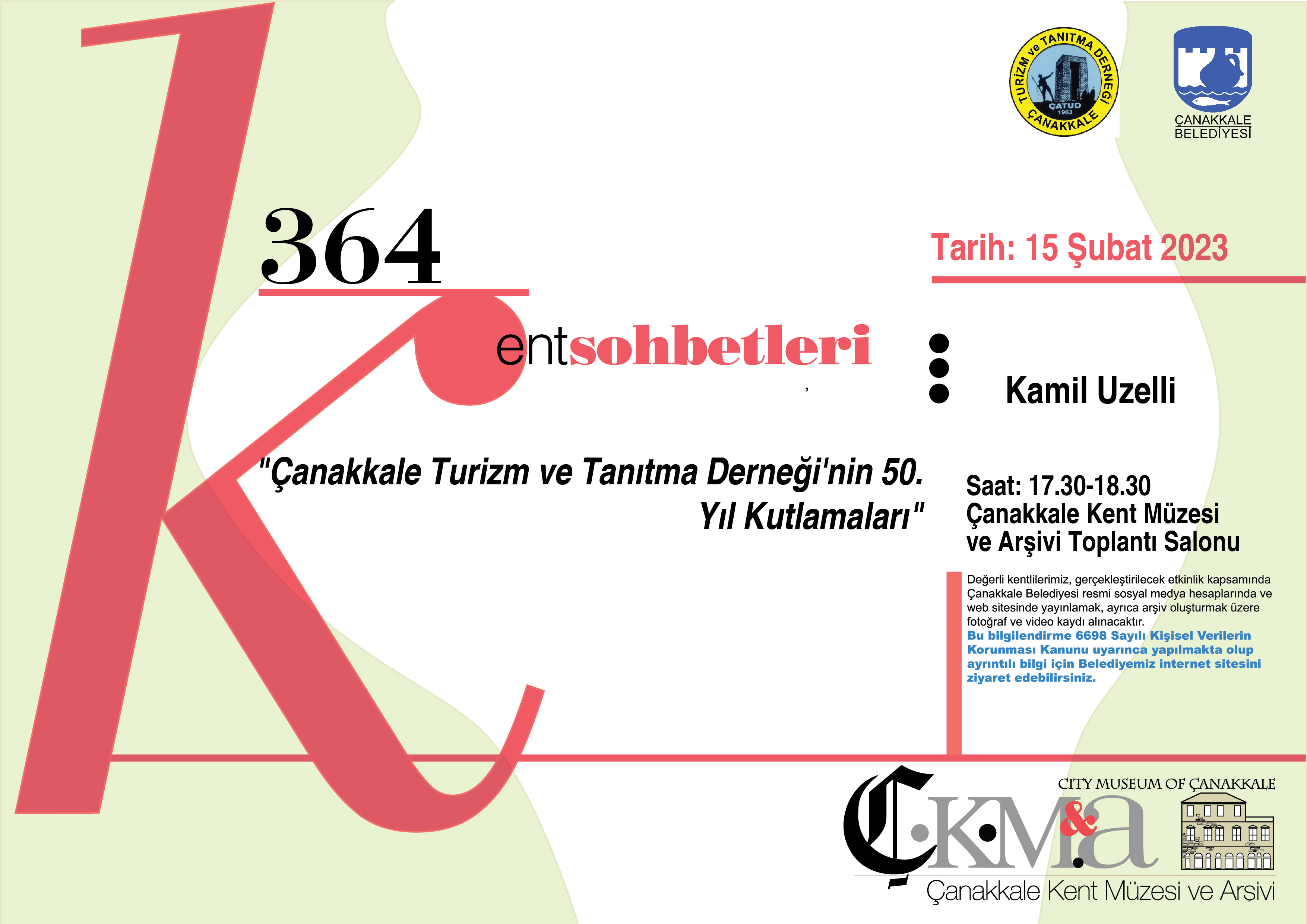 Kamil Uzelli'nin konuşmacı olarak katılacağı “Çanakkale Turizm ve Tanıtma Derneği'nin 50. Yıl Kutlamaları” başlıklı kent sohbeti, 15 Şubat 2023 Çarşamba günü 17.30-18.30 saatleri arasında Çanakkale Kent Müzesi ve Arşivi Toplantı Salonunda gerçekleşecek.