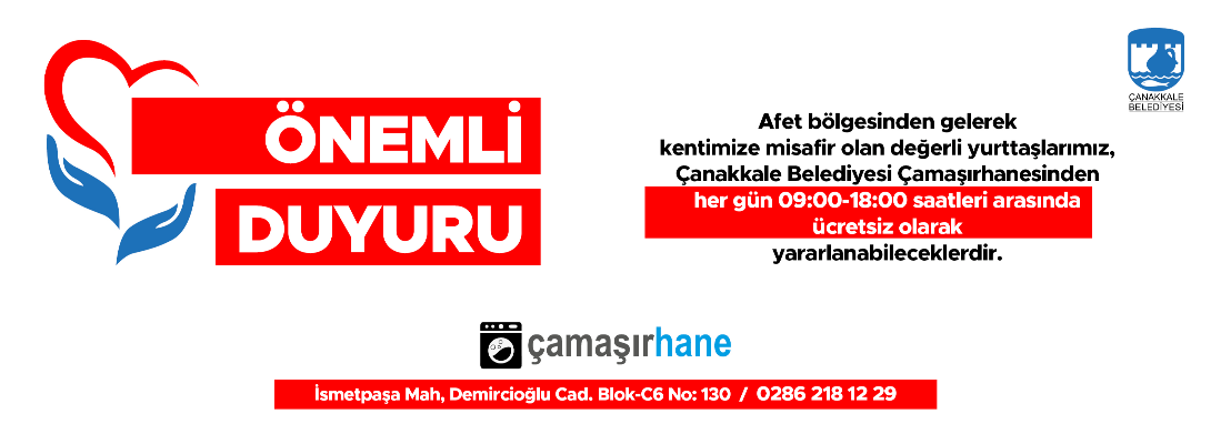 Afet bölgesinden gelerek kentimize misafir olan değerli yurttaşlarımız, Çanakkale Belediyesi Çamaşırhanesinden ücretsiz olarak her gün 09:00-18:00 saatleri arasında yararlanabileceklerdir.
