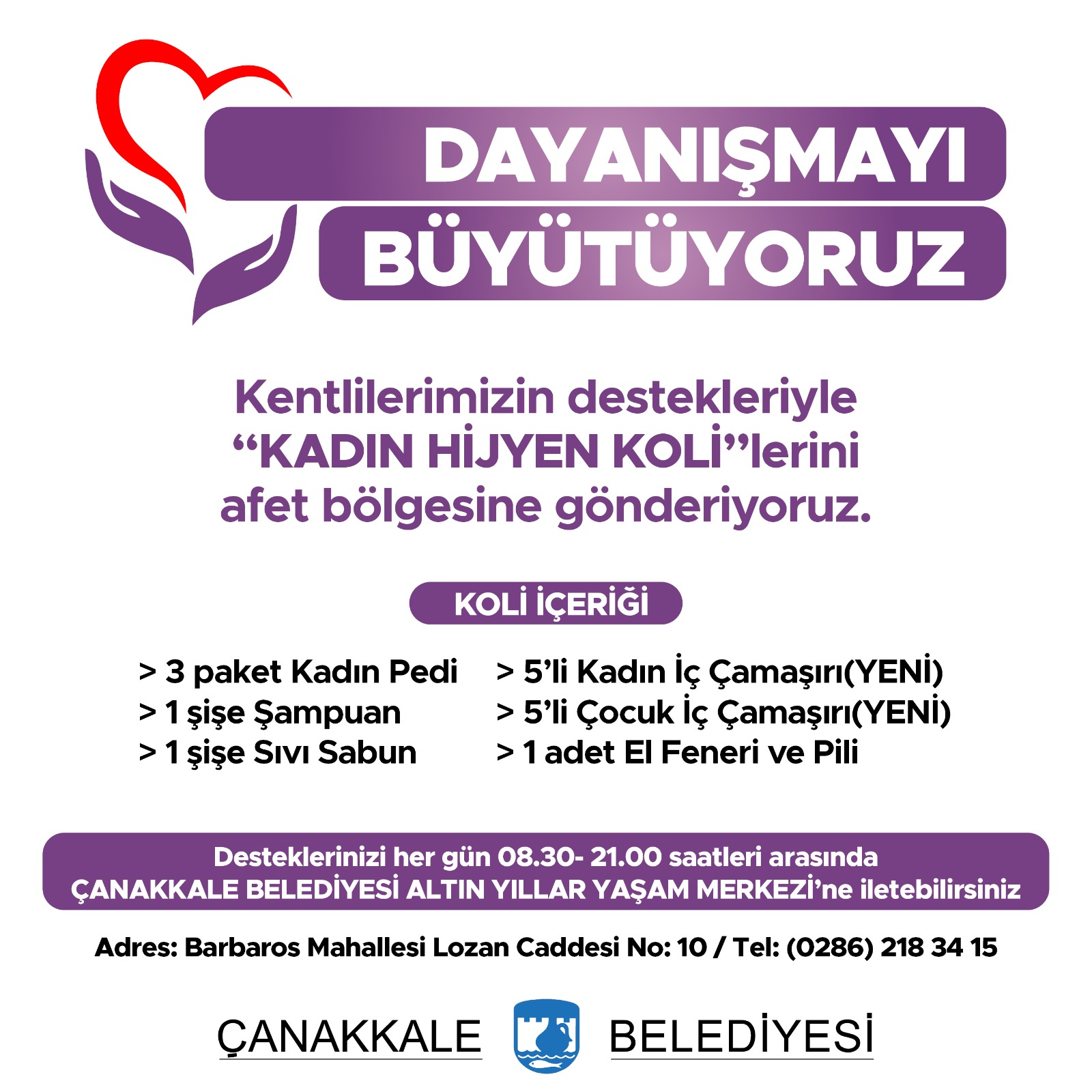 Kentlilerimizin destekleriyle “Kadın Hijyen Koli”lerini afet bölgesine gönderiyoruz.