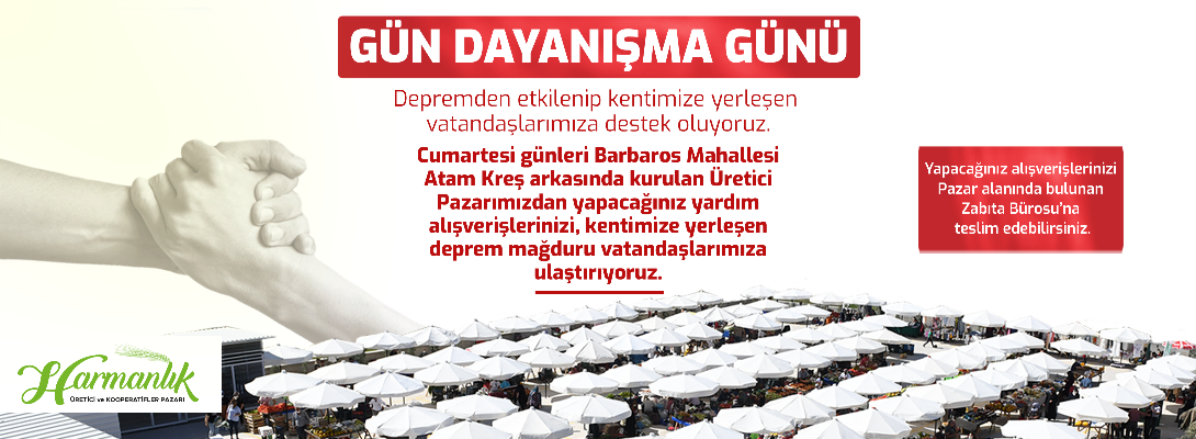 Depremden etkilenip kentimize yerleşen vatandaşlarımıza destek oluyoruz. Cumartesi günleri Barbaros Mahallesi Atam Kreş arkasında kurulan üretici pazarımızdan yapacağınız yardım alışverişlerinizi, kentimize yerleşen deprem mağduru vatandaşlarımıza ulaştırıyoruz.