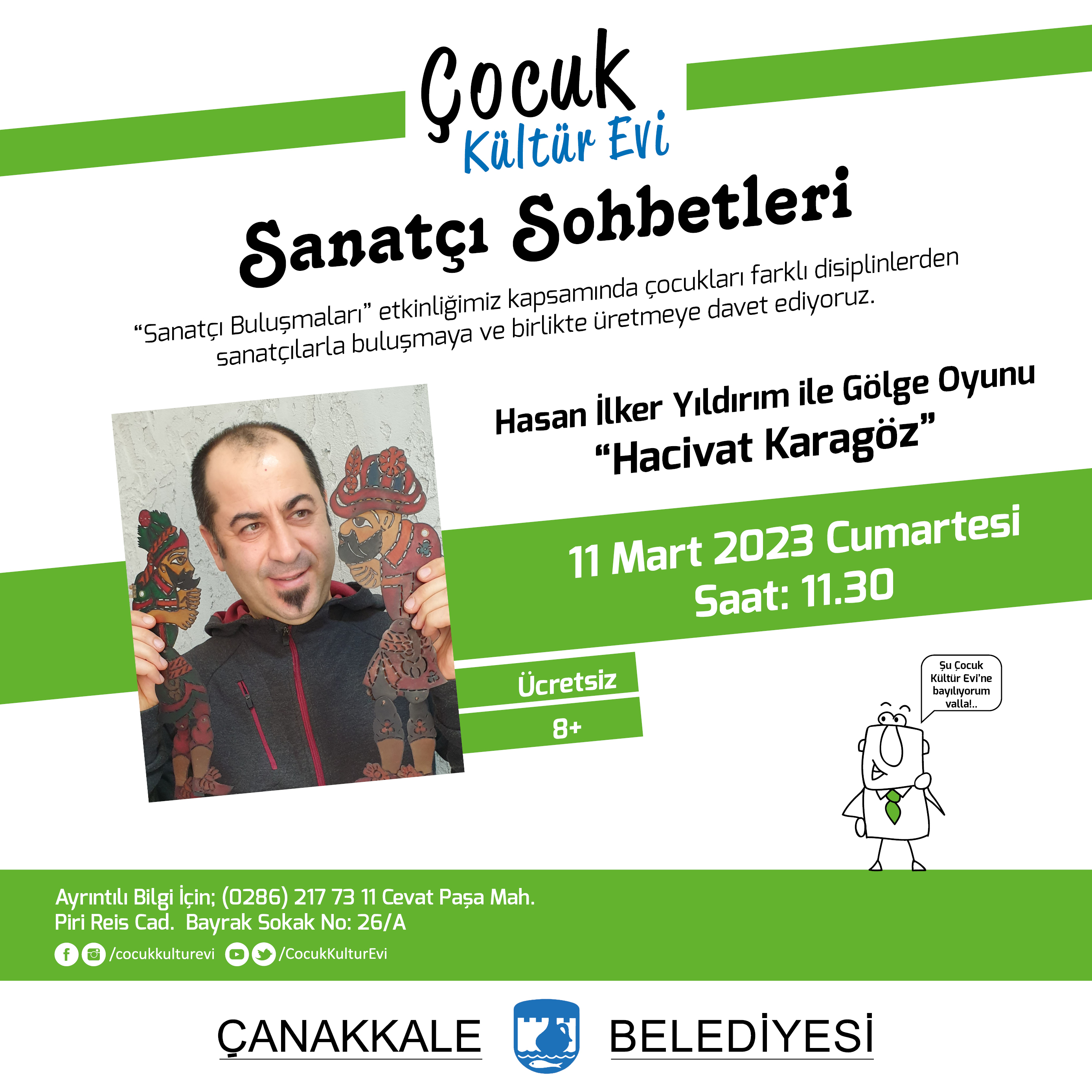 Sanatın farklı disiplinlerinde çalışmalarını yürüten sanatçılarla çocukları bir araya getiren “Sanatçı Buluşmaları” etkinliğinin mart ayı konuğu gölge oyunu sanatçısı, karagözcü Hasan İlker Yıldırım olacak. Sanatsever tüm çocukların büyük bir ilgiyle takip ettiği etkinlik, 11 Mart 2023 Cumartesi günü saat 11.00’de Çocuk Kültür Evi’nde gerçekleştirilecek.