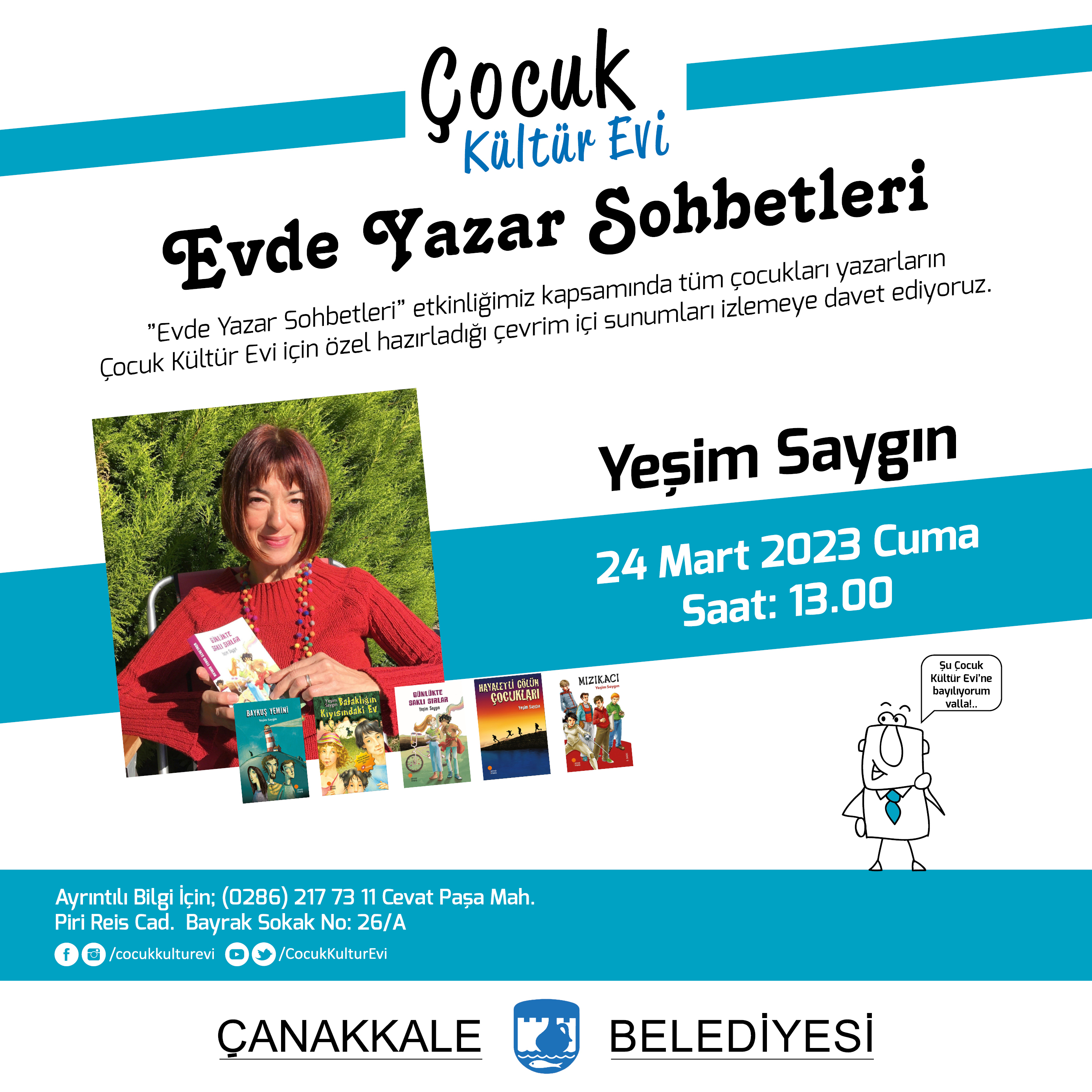 Edebiyatseverler tarafından merakla beklenen, çocukların erken yaşta kitap sevgisi edinmelerine ve edebiyatla nitelikli ilişki kurabilmelerine katkı sunan “Evde Yazar Sohbetleri” etkinliğinin mart ayı konuğu ise veren yazar Yeşim Saygın olacak. Çevrim içi gerçekleştirilecek olan etkinlik, 24 Şubat 2023 Cuma günü saat 13.00’te Çocuk Kültür Evi’nin sosyal medya hesapları üzerinden paylaşıma sunulacak.