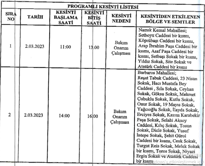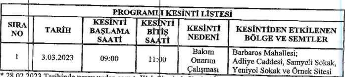 Enerji dağıtım şebekesinde yapılacak olan bakım onarım çalışması kapsamında görselde belirtilen tarih ve belirtilen yerlerde elektrik kesintisi uygulanacaktır.