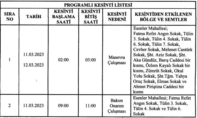 Enerji dağıtım şebekesinde yapılacak olan bakım onarım ve manevra çalışması kapsamında görselde belirtilen tarih ve belirtilen yerlerde elektrik kesintisi uygulanacaktır.