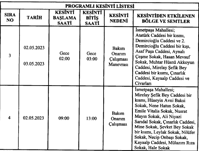 Enerji dağıtım şebekesinde yapılacak olan bakım onarım çalışması ve manevra çalışması kapsamında görselde belirtilen tarih ve belirtilen yerlerde elektrik kesintisi uygulanacaktır.