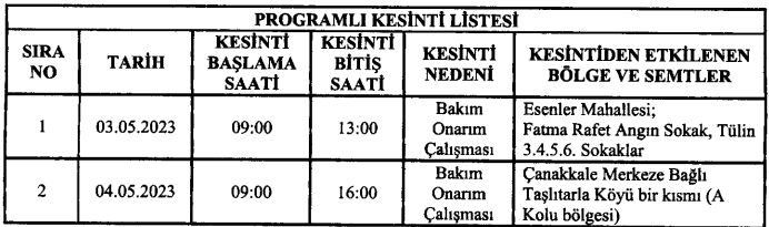 Uludağ Elektrik Dağıtım A.Ş. Çanakkale İşletme Bakım Mühendisliğinden yapılan açıklamaya göre;