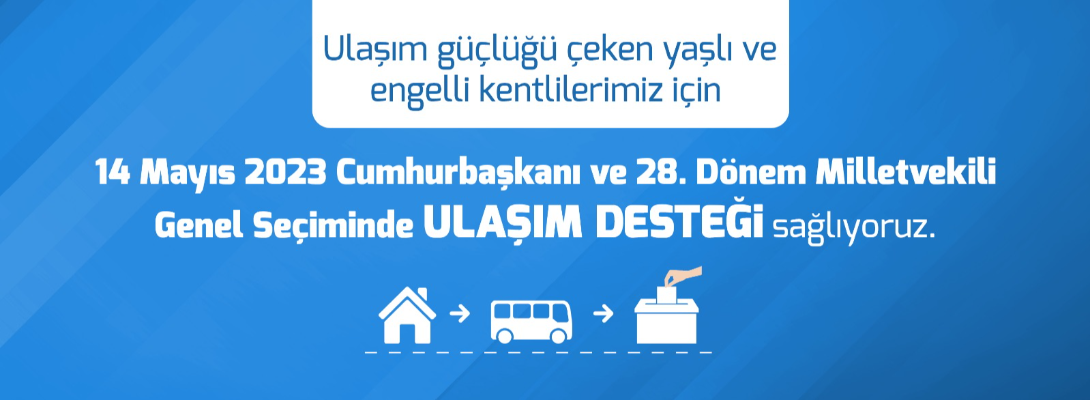 Ulaşım güçlüğü çeken yaşlı ve engelli kentlilerimiz için 14 Mayıs 2023 Cumhurbaşkanı ve 28. Dönem Milletvekili Genel Seçiminde ulaşım desteği sağlıyoruz.