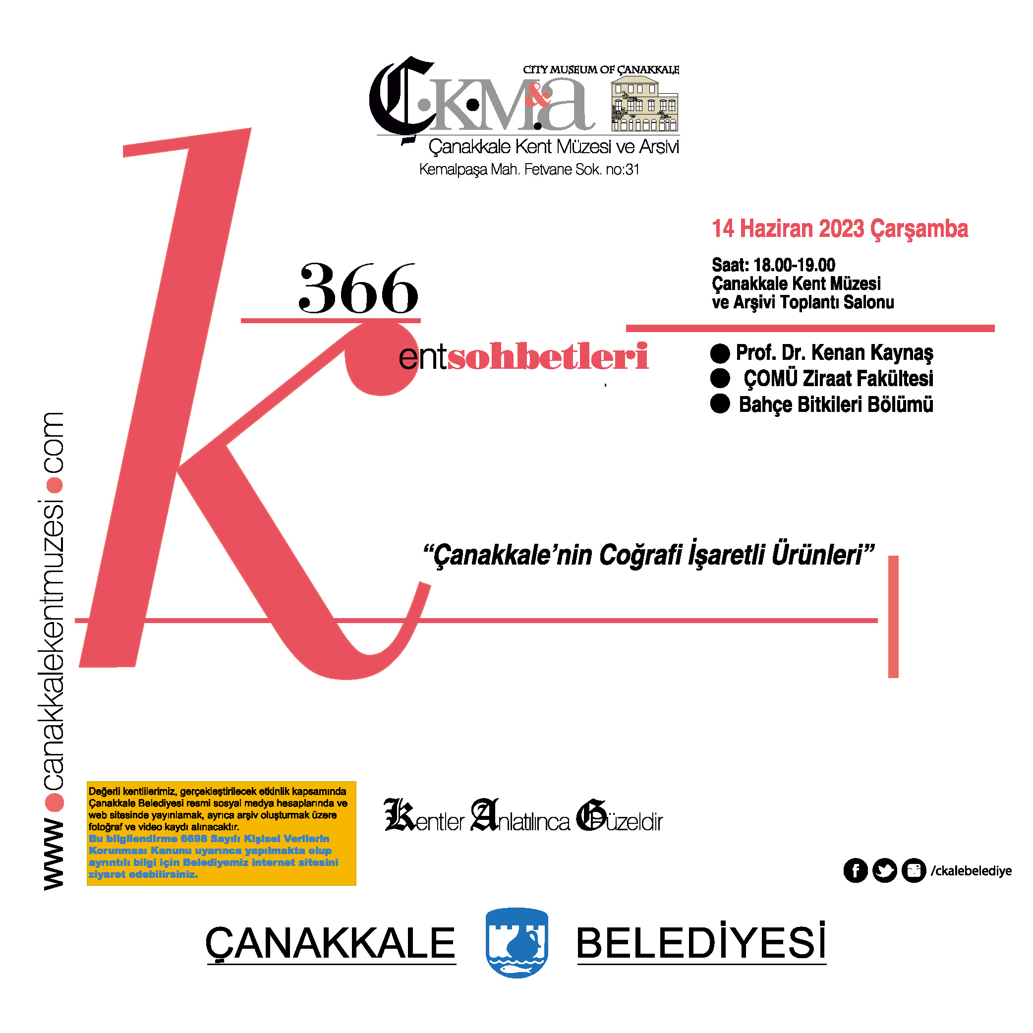ÇOMÜ Ziraat Fakültesi Bahçe Bitkileri Bölümünden Prof. Dr. Kenan Kaynaş'ın konuşmacı olarak katılacağı 'Çanakkale'nin Coğrafi İşaretli Ürünleri' isimli kent sohbeti, 14 Haziran 2023 Çarşamba günü 18.00-19.00 saatleri arasında Çanakkale Kent Müzesi ve Arşivi Toplantı Salonunda gerçekleşecek.
