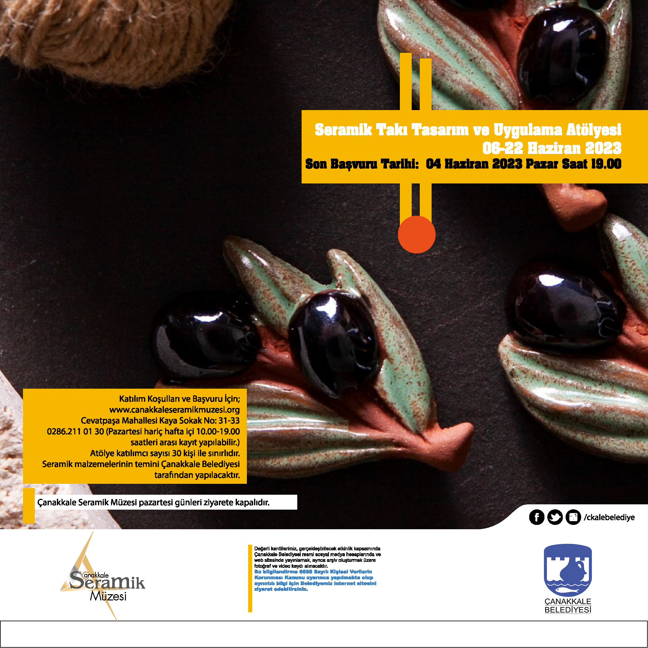 Çanakkale Seramik Müzesinde 6-22 Haziran tarihleri arasında gerçekleşecek Seramik Takı Tasarım ve Uygulama Atölyesi için son başvuru tarihi de 4 Haziran 2023 Pazar saat 19.00.