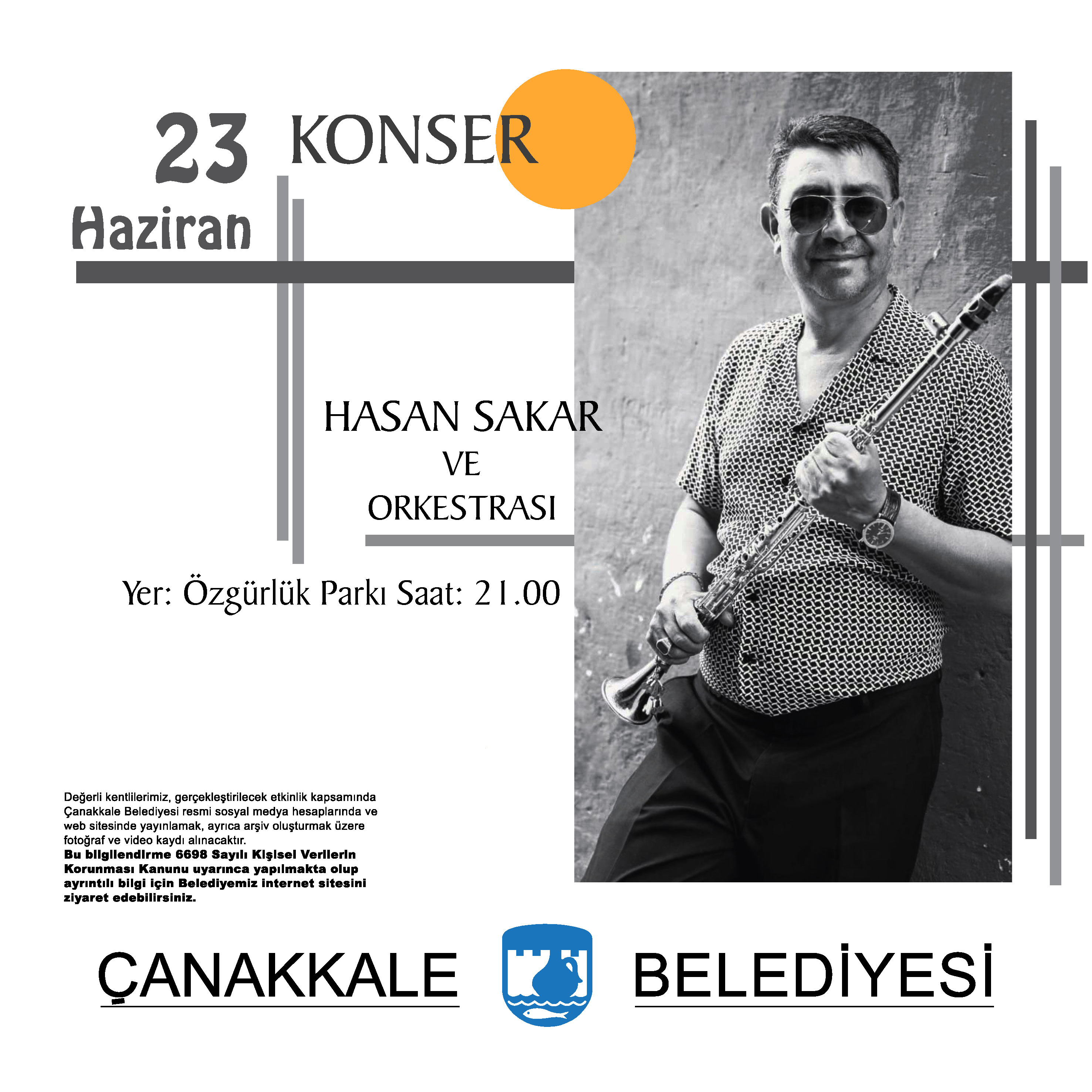 23 Haziran 2023 Cuma günü saat 21.00'da Özgürlük Parkında Hasan Sakar ve Orkestrası sahne alacak.