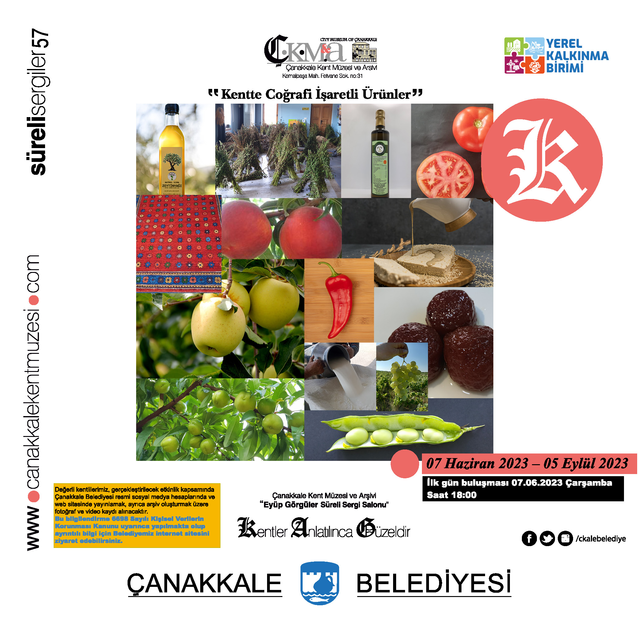 Haziran ayı kültür sanat etkinlikleri kapsamında bir diğer süreli sergi de Çanakkale Kent Müzesi ve Arşivi Eyüp Görgüler Süreli Sergi Salonunda ziyarete açılacak. Kentte Coğrafi İşaretli Ürünler sergisinin ilk gün buluşması 7 Haziran 2023 Çarşamba günü saat 18.00'da gerçekleşecek.