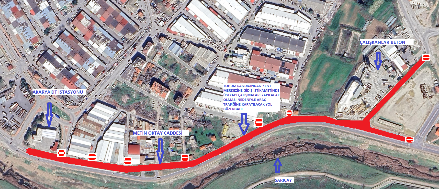 Çanakkale Belediyesi Fen İşleri Müdürlüğünce 7 – 19 Haziran 2023 tarihleri arasında Metin Oktay Caddesi üzerinde üstyapı çalışmaları gerçekleştirilecek olup, belirtilen tarihlerde yol araç trafiğine kapatılacaktır. Belediyemiz Tohum Sandığından kent merkezine gidiş istikametinde yapılacak çalışmalar için araç trafiği alternatif ulaşım güzergâhlarına yönlendirilecektir.