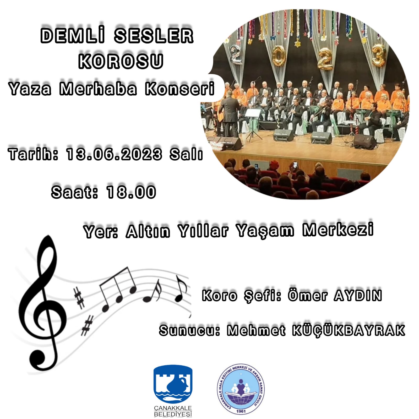 13 Haziran 2023 Salı günü saat 17.30'da Altın Yıllar Yaşam Merkezi katılımcılarının karma sergisi ile saat 18.00'de Demli Sesler Korosunun Yaza Merhaba Konseri, Çanakkale Belediyesi Altın Yıllar Yaşam Merkezi'nde gerçekleşecek.