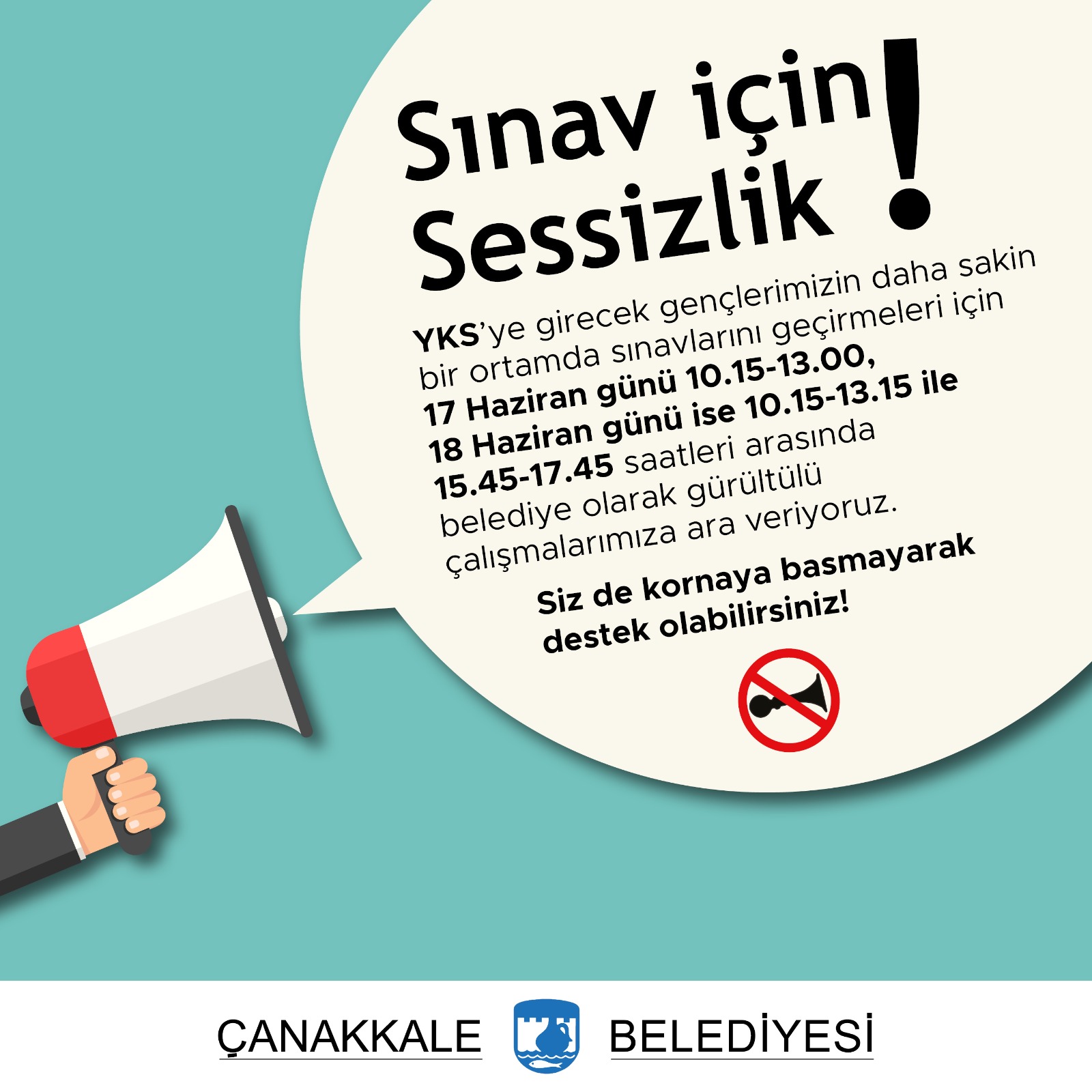 2023 yılı Yükseköğretim Kurumları Sınavı (YKS), 17-18 Haziran 2023 tarihlerinde gerçekleşecek olup, sınavın rahat ve sakin bir ortamda gerçekleşmesi için Çanakkale Belediyesince yetki alanlarının tümünde gerekli önlemler alınmıştır. Kentlilerimizin de sınav saatlerinde özellikle sessizlik konusunda hassasiyet göstermesi önem taşımaktadır.
