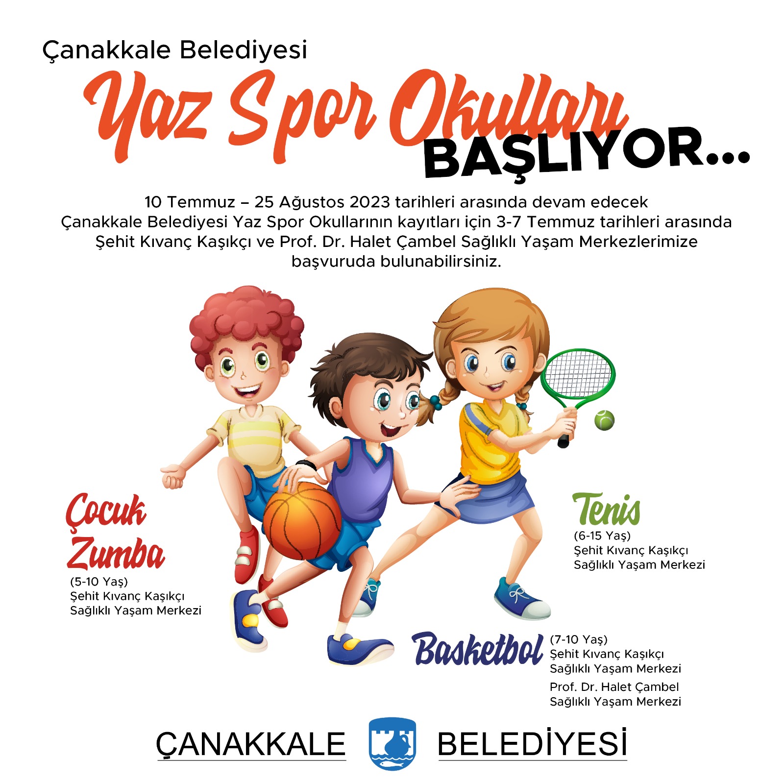 10 Temmuz-25 Ağustos 2023 tarihleri arasında gerçekleşecek olan Çanakkale Belediyesi Yaz Spor Okullarının kayıtları için 3-7 Temmuz 2023 tarihleri arasında Şehit Kıvanç Kaşıkçı ve Prof. Dr. Halet Çambel Sağlıklı Yaşam Merkezlerimize başvuruda bulunabilirsiniz.
