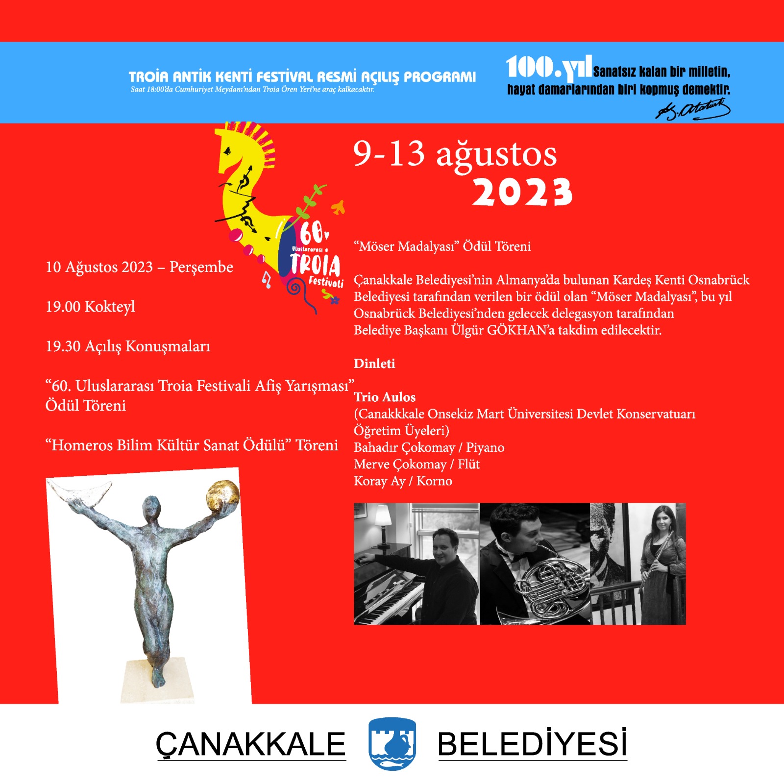 60. Uluslararası Troia Festivali'nin ikinci gün etkinlikleri de dopdolu… Troia Antik Kenti'nde gerçekleşecek olan Festival Resmi Açılış Töreninin yanı sıra konser, tiyatro, söyleşi ve daha pek çok etkinlik kentlilerimizi bekliyor.