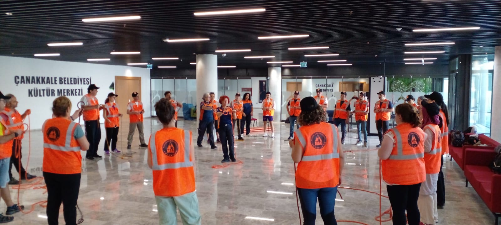 Bu süreçte eğitimleri eksiksiz tamamlayan gönüllülerden oluşan grup, Çanakkale Belediyesi Yeşil Yerel Yönetim Binası ve Kültür Merkezi Amfi tiyatro meydanında yüksek açı çalışması, yaralı taşıması, ip düğümleri, ilk yardım eğitimlerini uygulamalı olarak aldı. Çalışmalar kapsamında afet öncesi farkındalık çalışmalarının önemi ve afet olduğunda ilk yapılacak işler detaylı bir şekilde öğrenildi.