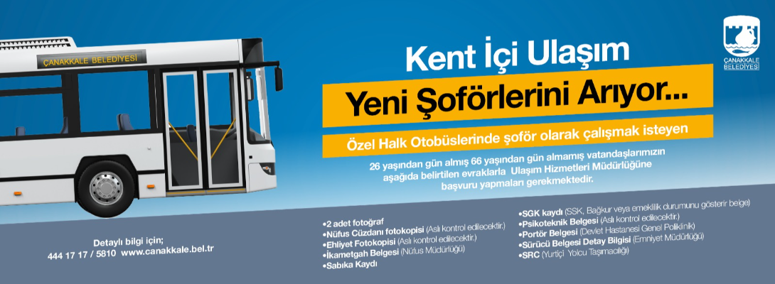 Özel Halk Otobüslerinde şoför olarak çalışmak isteyen 26 yaşından gün almış, 66 yaşından gün almamış vatandaşlarımızın aşağıda belirtilen evraklarla Ulaşım Hizmetleri Müdürlüğüne başvuru yapmaları gerekmektedir.