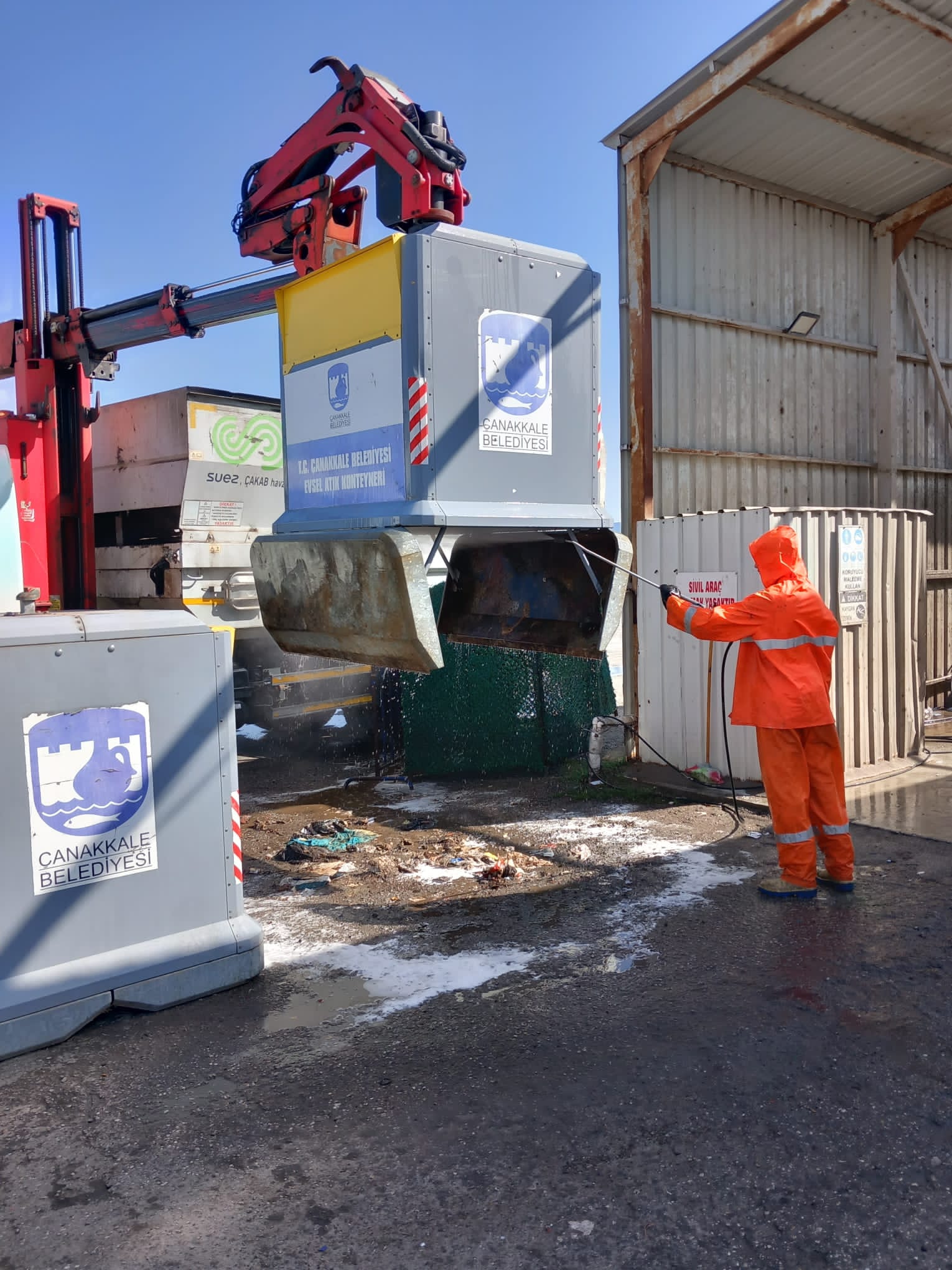Çanakkale Belediyesi Temizlik İşleri Müdürlüğünce temiz bir kent için yürütülen çalışmalar kapsamında, atıkların toplandığı konteynerler de düzenli olarak temizleniyor.