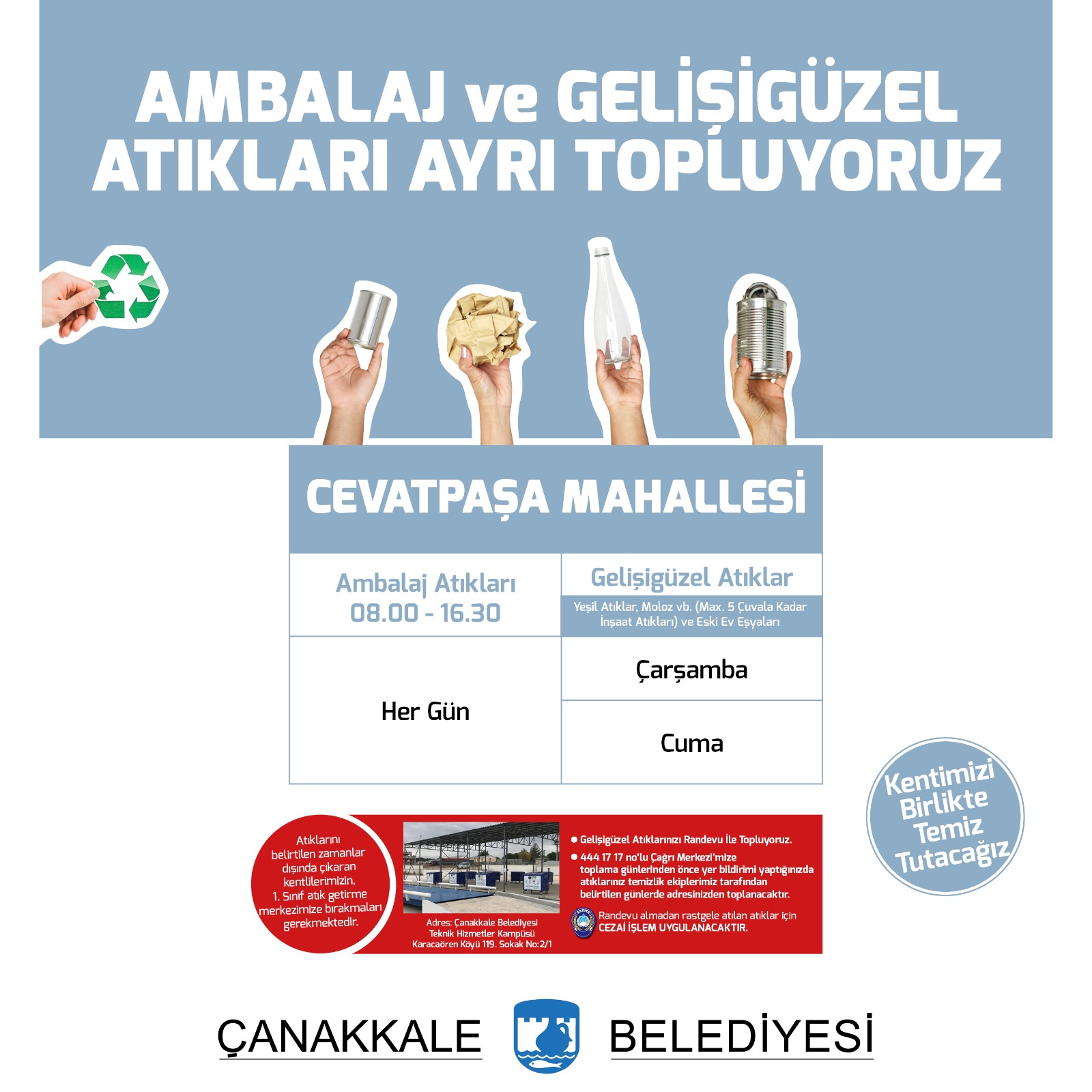 Çanakkale Belediyesi Temizlik İşleri Müdürlüğü tarafından daha temiz bir kent için aralıksız gerçekleştirilen çalışmalar kapsamında ambalaj atıkları ile yeşil atıklar, moloz vb. (Max. 5 çuvala kadar inşaat atıkları) ve eski ev eşyalarından oluşan gelişigüzel atıklar, diğer atıklardan ayrı olarak toplanmaya devam ediyor. Atıkların mahalleler bazında toplama günlerini belirten broşürler de kentin çeşitli noktalarına asılarak, bilgilendirme çalışmaları yürütülüyor.