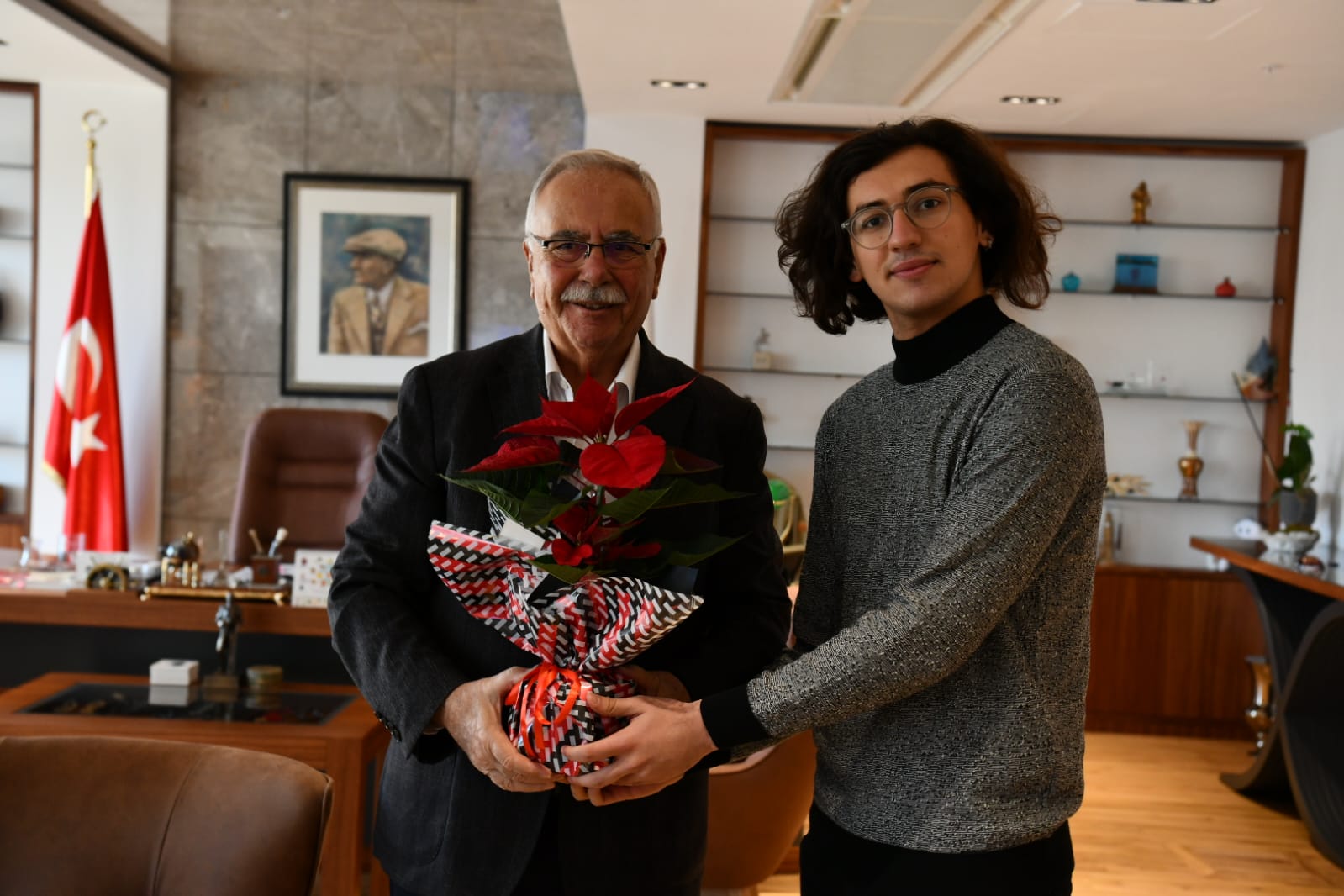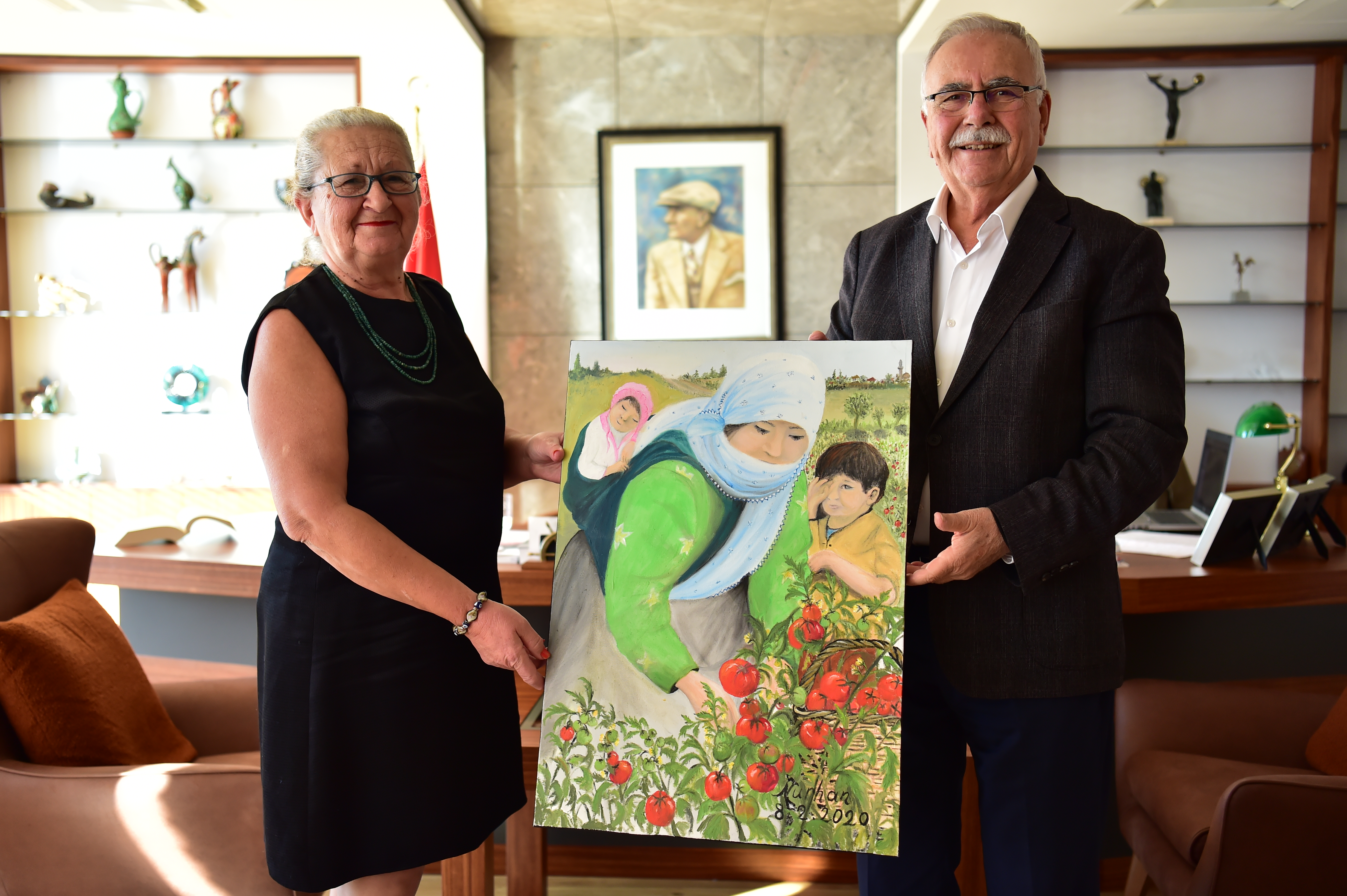 Başkan Gökhan son olarak Ressam Namie Nurhan Şakar’ı makamında ağırladı. Karşılıklı sohbet ortamında geçen ziyarette Şakar, yaptığı yağlı boya çalışmaları ve eserleri hakkında Başkan Gökhan’a bilgiler verdi. Ziyaret sonunda Şakar, Başkan Gökhan’a Çanakkale Belediyesi Tohum Sandığı’na asılması için Çanakkale domatesinin resmedildiği bir tablo hediye etti.