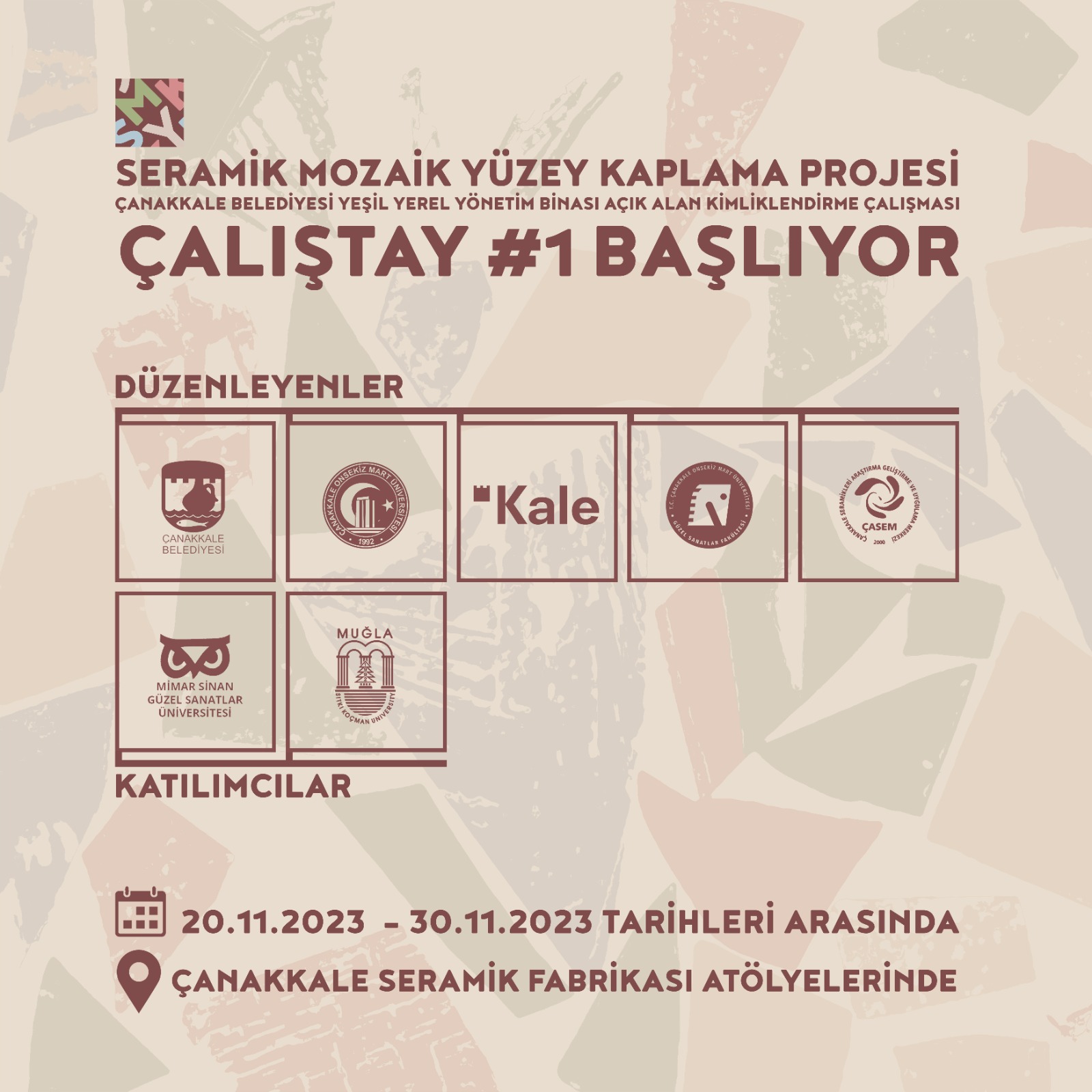 Çanakkale Belediyesi, Çanakkale Onsekiz Mart Üniversitesi (Güzel Sanatlar Fakültesi, Çanakkale Seramikleri Araştırma Geliştirme ve Uygulama Merkezi) ile Kaleseramik Çanakkale Kalebodur Seramik San. A.Ş. işbirliğinde, Çanakkale Belediyesi Yeşil Yerel Yönetim Binası Açık Alan Kimliklendirme Çalışması kapsamında hayata geçirilen Seramik Mozaik Yüzey Kaplama Projesi'nin ilk çalıştayı 20 Kasım 2023 tarihinde başlıyor.