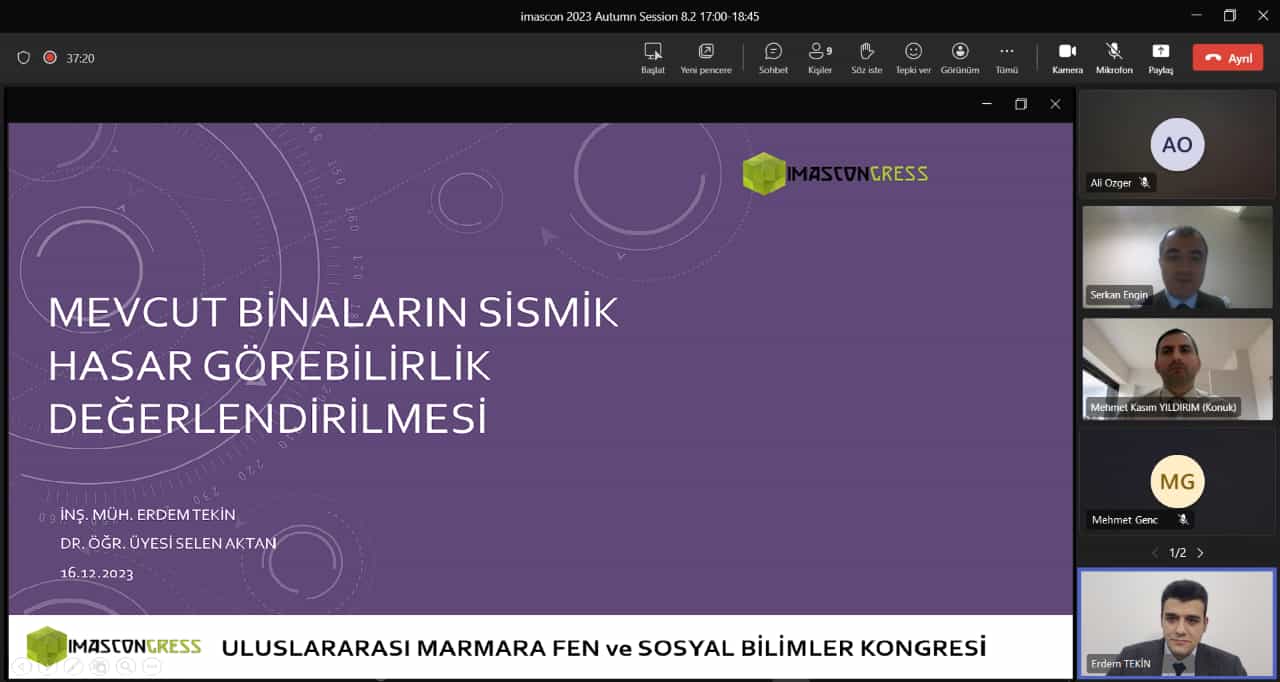 Online olarak düzenlenen 11. Uluslararası Marmara Fen Bilimleri Kongresinde sunum yapan Tekin, Mevcut Binaların Sismik Hasar Görebilirlik Değerlendirmesi konusunda bilgiler verdi. Aynı zamanda, hızlı sismik risk değerlendirme yöntemi ile ilgili kalibrasyon çalışmaları yapmakta olan Tekin, Çanakkale İl merkezinde sokak taraması ve ön değerlendirme kapsamında bir süredir yapmış olduğu bilimsel çalışmalarının sonuçlarının da paylaştı.