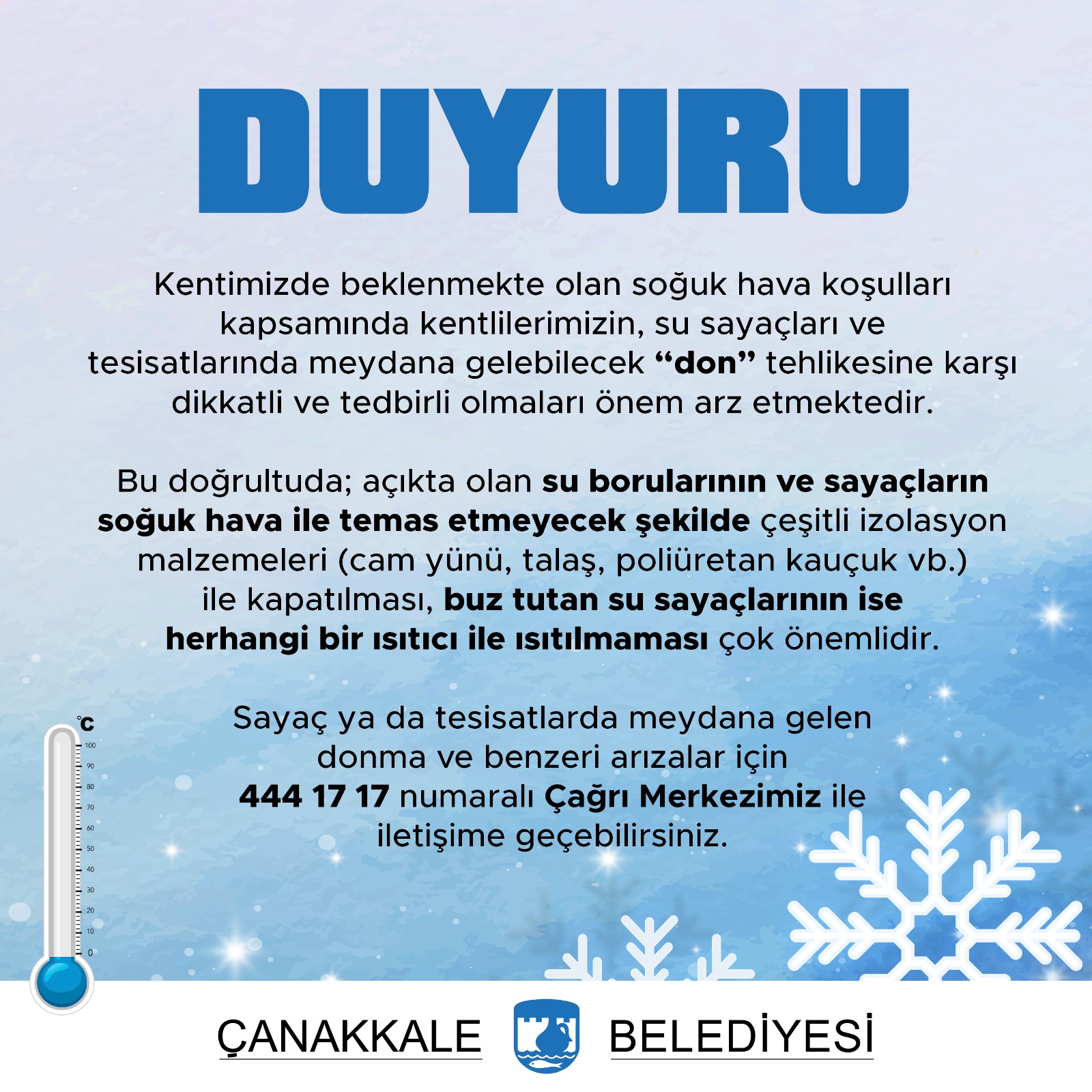 Kentimizde beklenmekte olan soğuk hava koşulları kapsamında kentlilerimizin su sayaçları ve tesisatlarında meydana gelebilecek don tehlikesine karşı dikkatli ve tedbirli olmaları önem arz etmektedir.