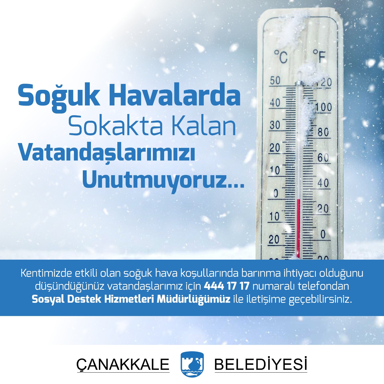 Kentimizde etkili olan soğuk hava koşullarında barınma ihtiyacı olduğunu düşündüğünüz vatandaşlarımız için 444 17 17 numaralı telefondan Sosyal Destek Hizmetleri Müdürlüğümüz ile iletişime geçebilirsiniz.