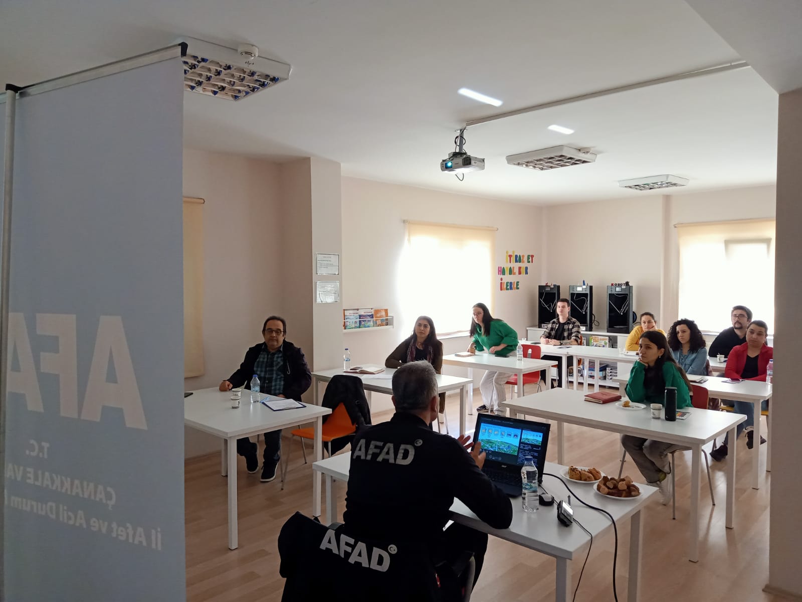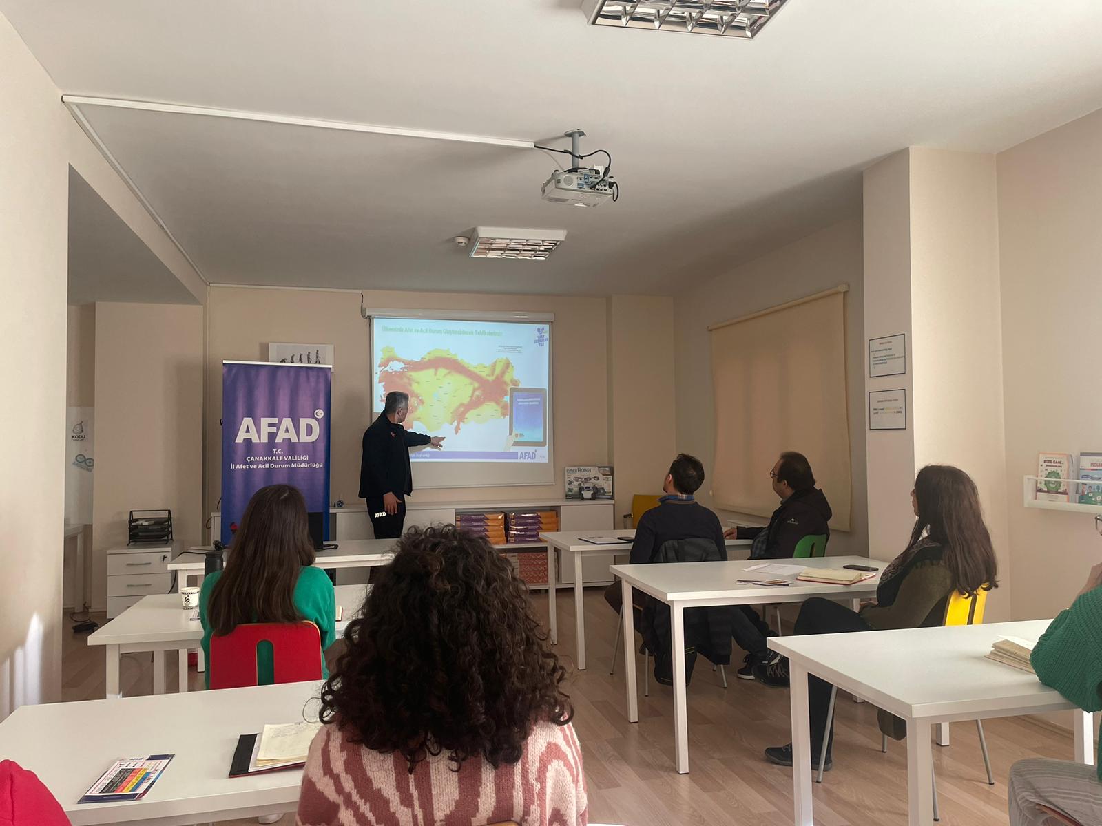 Afetlere Hazır Türkiye Projesi kapsamında eğitim ve öğrenimin yarıyıl tatile girmesiyle birlikte Çanakkale Belediyesi Afet İşleri Müdürlüğü ile İl Afet ve Acil Durum Müdürlüğü Eğitim Şube Müdürlüğü koordinasyonunda Çocuk Kültür Evi personel ve öğretmenlerine yönelik afet farkındalık eğitimi verildi.